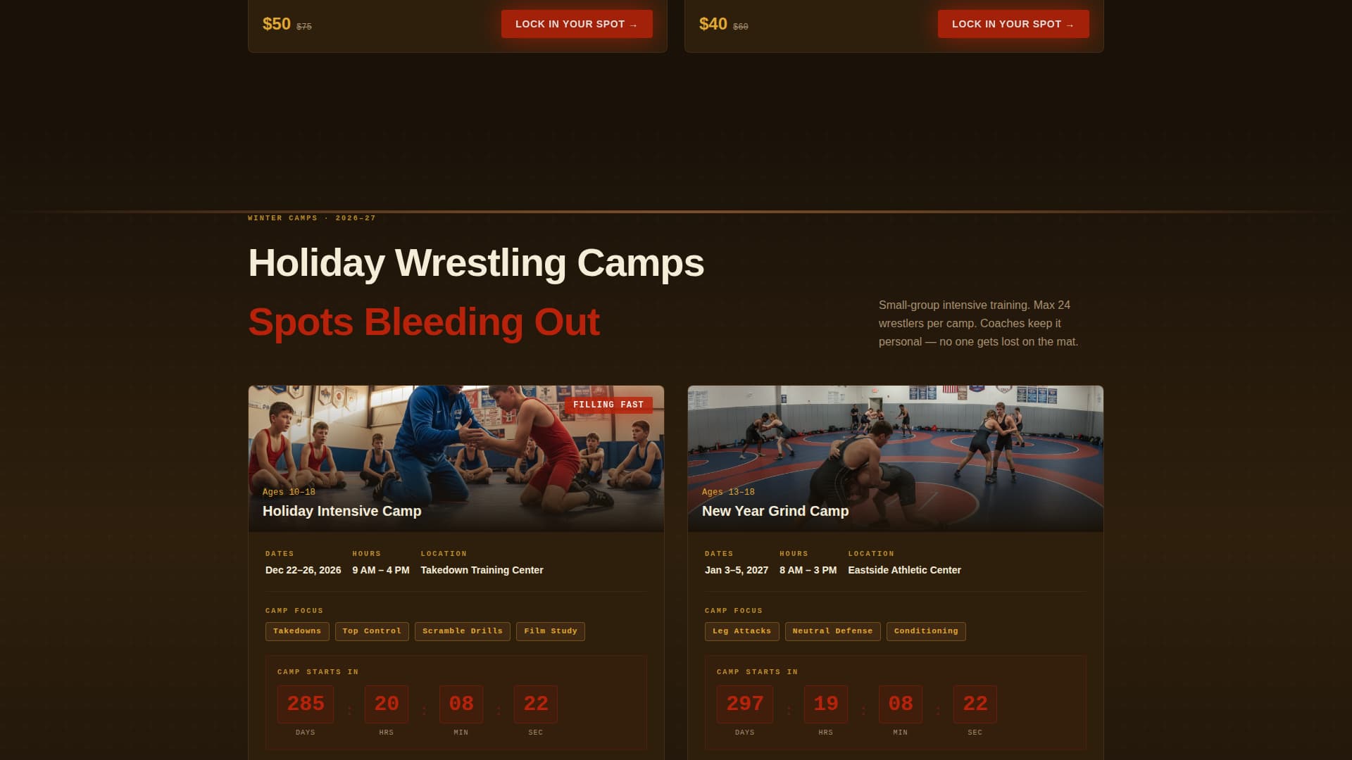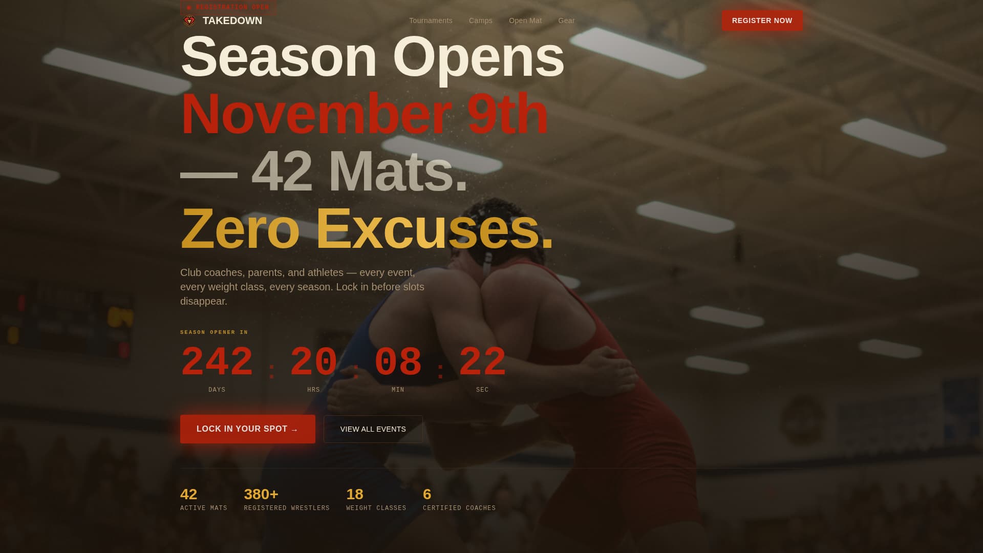 Takedown is a high-impact, single-column landing page for wrestling clubs and amateur programs. It scrolls through the full competitive season, from tournament registration to summer clinics, using bold visuals, real-time scarcity signals, and repeated purchase prompts. The design feels like tournament Saturday at a packed gymnasium.