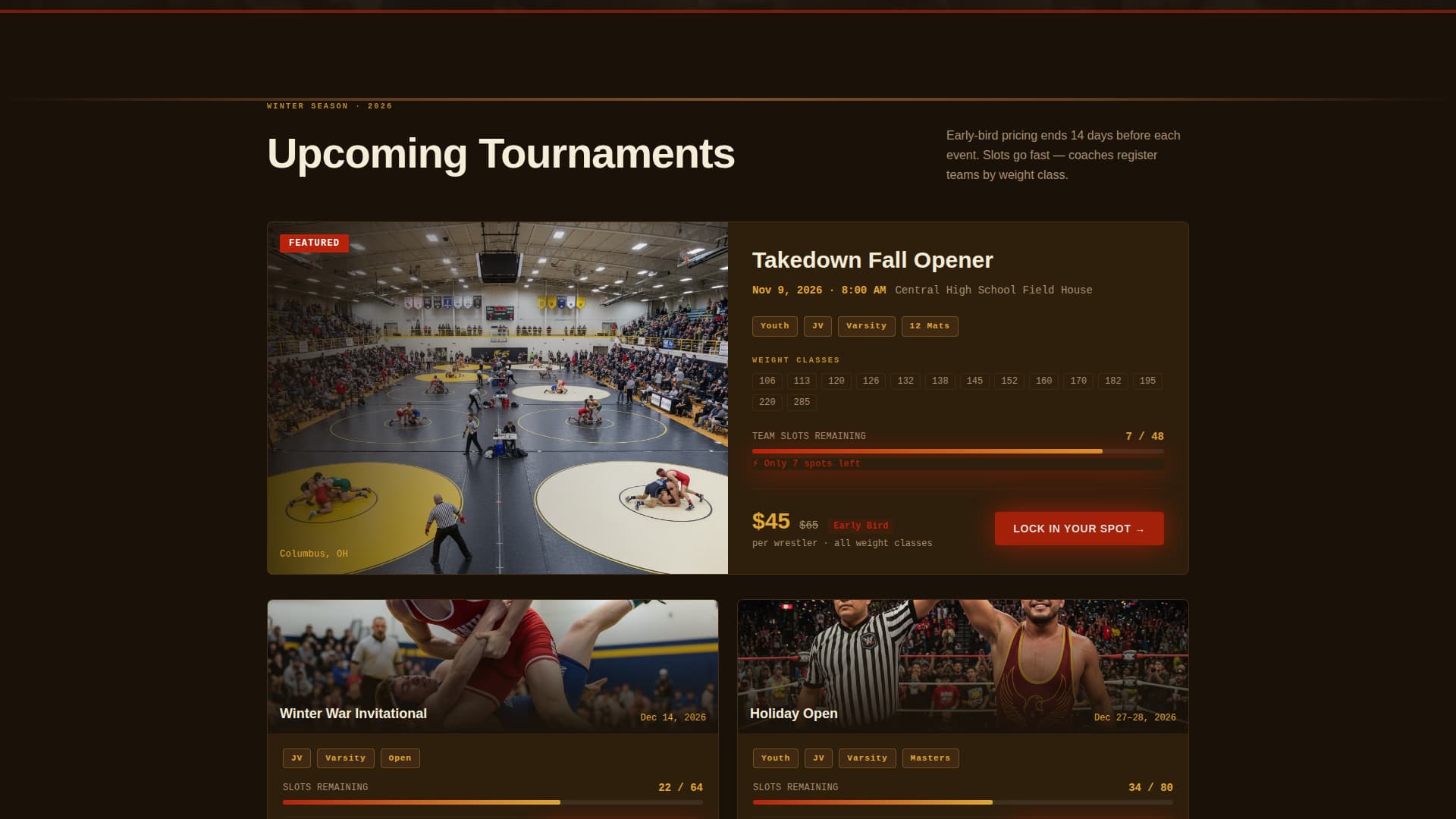 Wrestling programs often lose registrations because their event pages feel scattered or slow to act on. Coaches and parents need to see dates, weight classes, and available spots at a glance. Hesitation costs spots, and spots are genuinely limited.