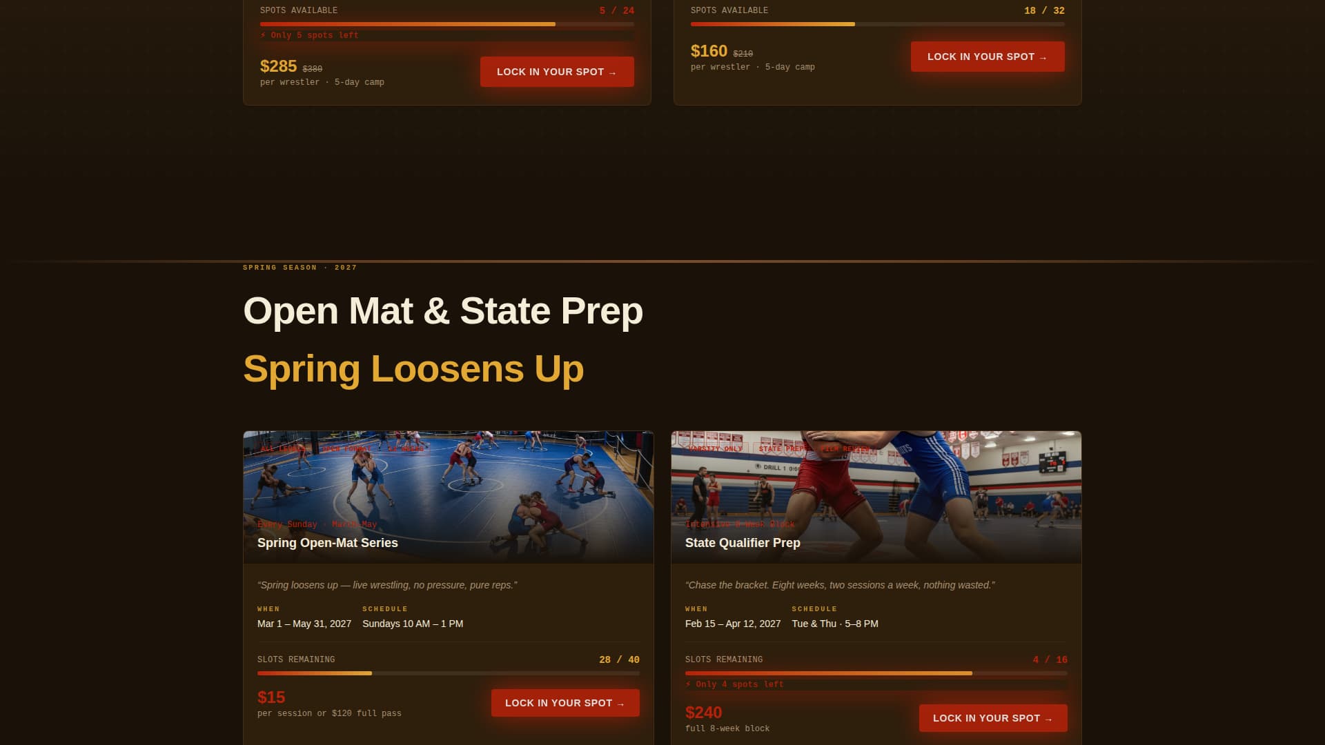 A "Lock In Your Spot" call-to-action button appears after every seasonal block. Each click leads to a quick-purchase flow: select event, choose weight class, enter wrestler name and age, then pay. The path from interest to purchase stays short.