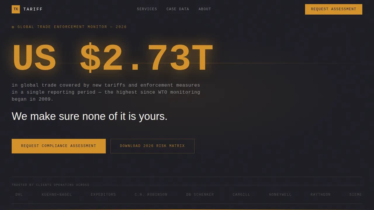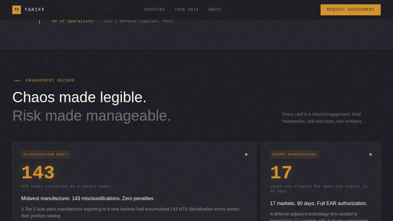 The Tariff Data Command Trade Compliance Landing Page Template is a modular card-grid layout built for trade compliance consulting firms. It uses a Charcoal and Amber color system and a Stats-First Impact creative direction to convert logistics directors, compliance officers, and operations VPs into qualified leads. Data-driven cards, animated interactions, and dual conversion paths make every scroll count.