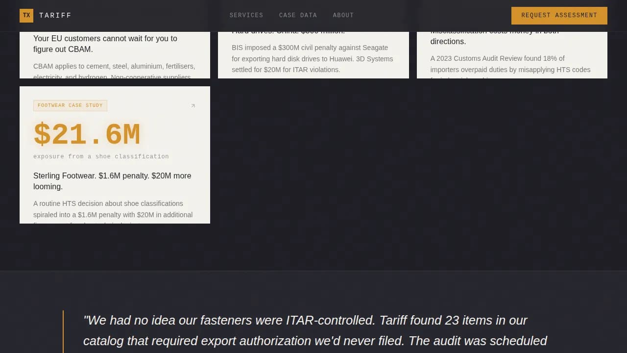 Single-line pull quotes from compliance officers appear between card clusters. These quotes ground the tariff data in human experience. They provide a natural pacing break and reinforce trust before the next set of evidence cards loads.