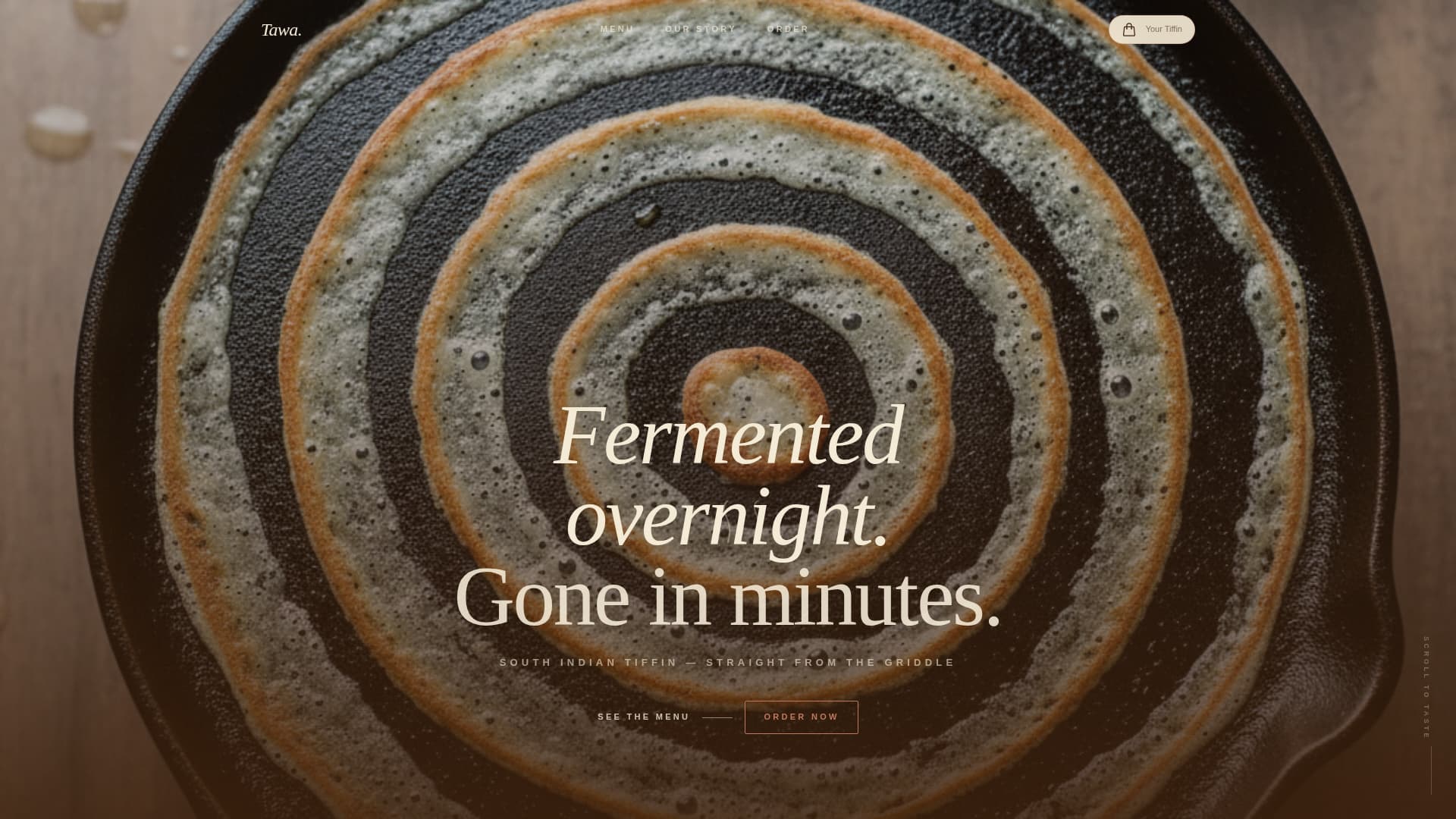 Tawa is a single-page landing page template designed for dosa restaurants and South Indian quick-service eateries. It uses a Gallery Walk layout to turn dish browsing into a sales journey. Every scroll reveals a new photograph paired with dish details and an "Add to Tiffin" button. The result feels warm, tactile, and genuinely appetising.