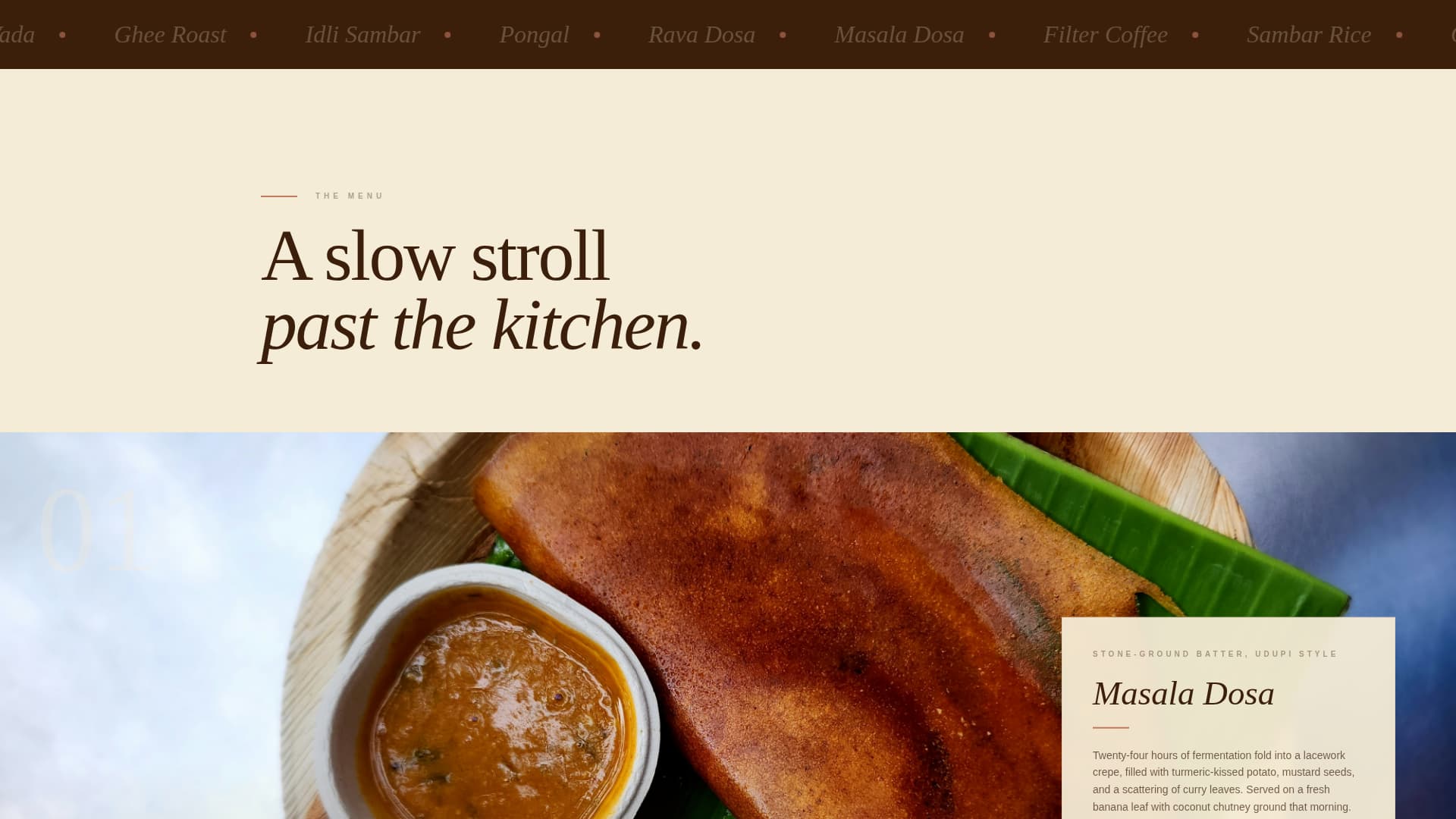The header opens on a razor-thin depth-of-field close-up of a dosa surface. A single cream-coloured headline fades in after a beat, setting an immersive, appetite-driven first impression before any menu item appears.