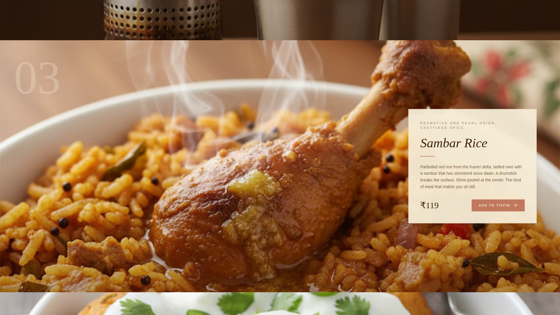 Every gallery dish card carries its own "Add to Tiffin" button. Visitors can build an order incrementally as they scroll, without needing to navigate to a separate cart or menu page.