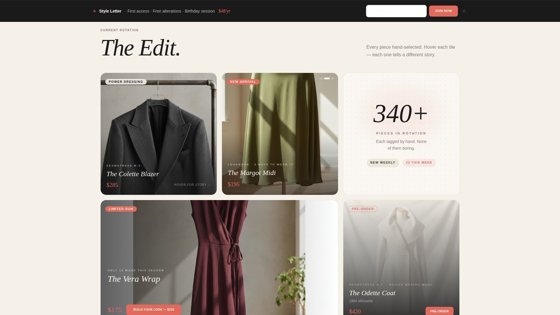 Thread is a single-page bento grid template designed for brick-and-mortar boutiques selling women's clothing. It leads with a full-bleed owner photo, layers in tactile micro-interactions across the grid, and closes the sale through bundle upsells and a membership bottom bar. The Ink and Paper color system keeps every visual choice deliberate and editorial.