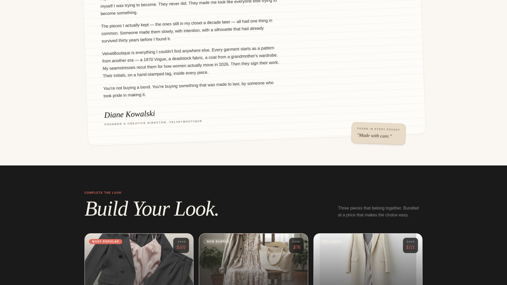 Midway through the page, a full-width tile breaks the bento grid entirely. It displays a scanned handwritten note from the owner explaining why she opened the store. Placed on cream like a letter found in a coat pocket, this moment humanizes the brand in a way no product description can.