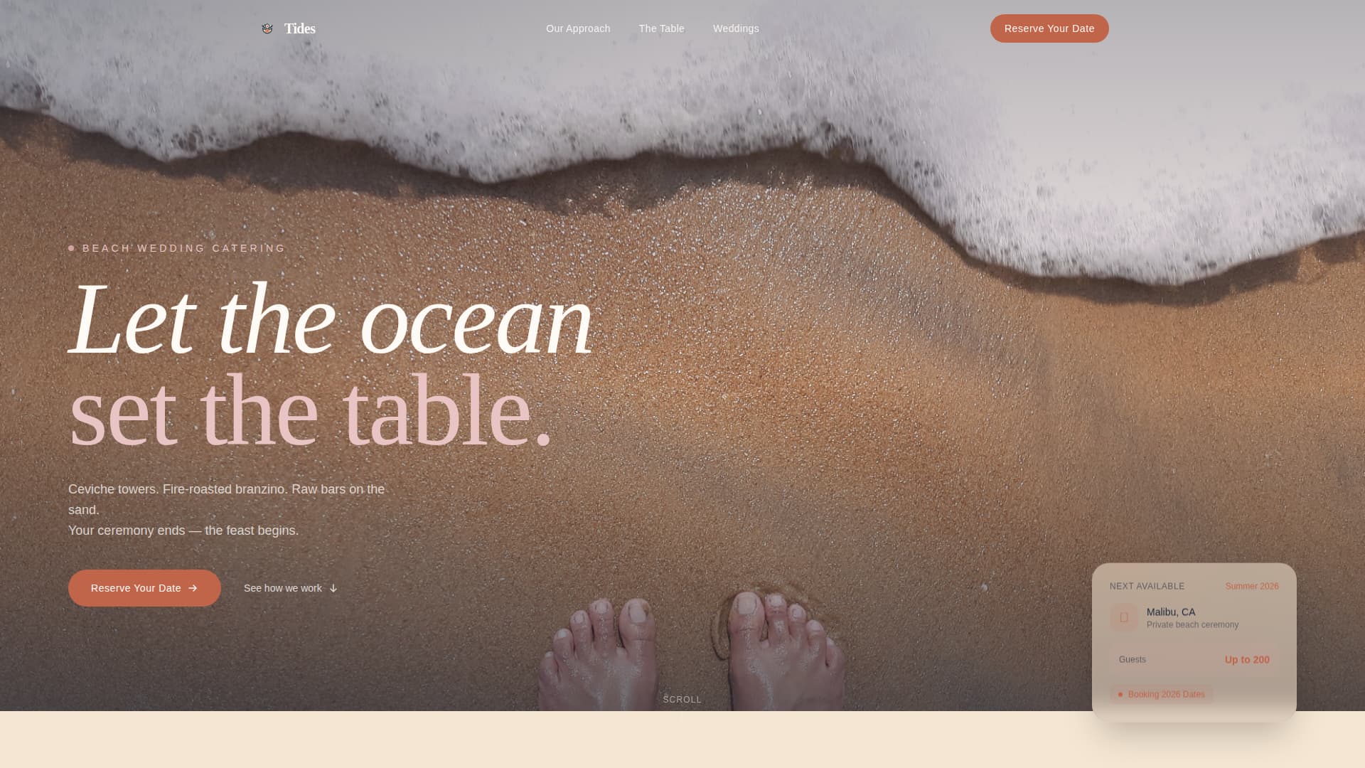 Tides is a cinematic, overlap-layered landing page built for beach wedding caterers. It guides visitors through a sensory scroll sequence, prep, setting, feast, and quiet aftermath, before inviting them to reserve a date or download a tasting menu. The Desert Rose color palette and editorial portrait header make the first impression feel as warm as golden hour on the sand.
