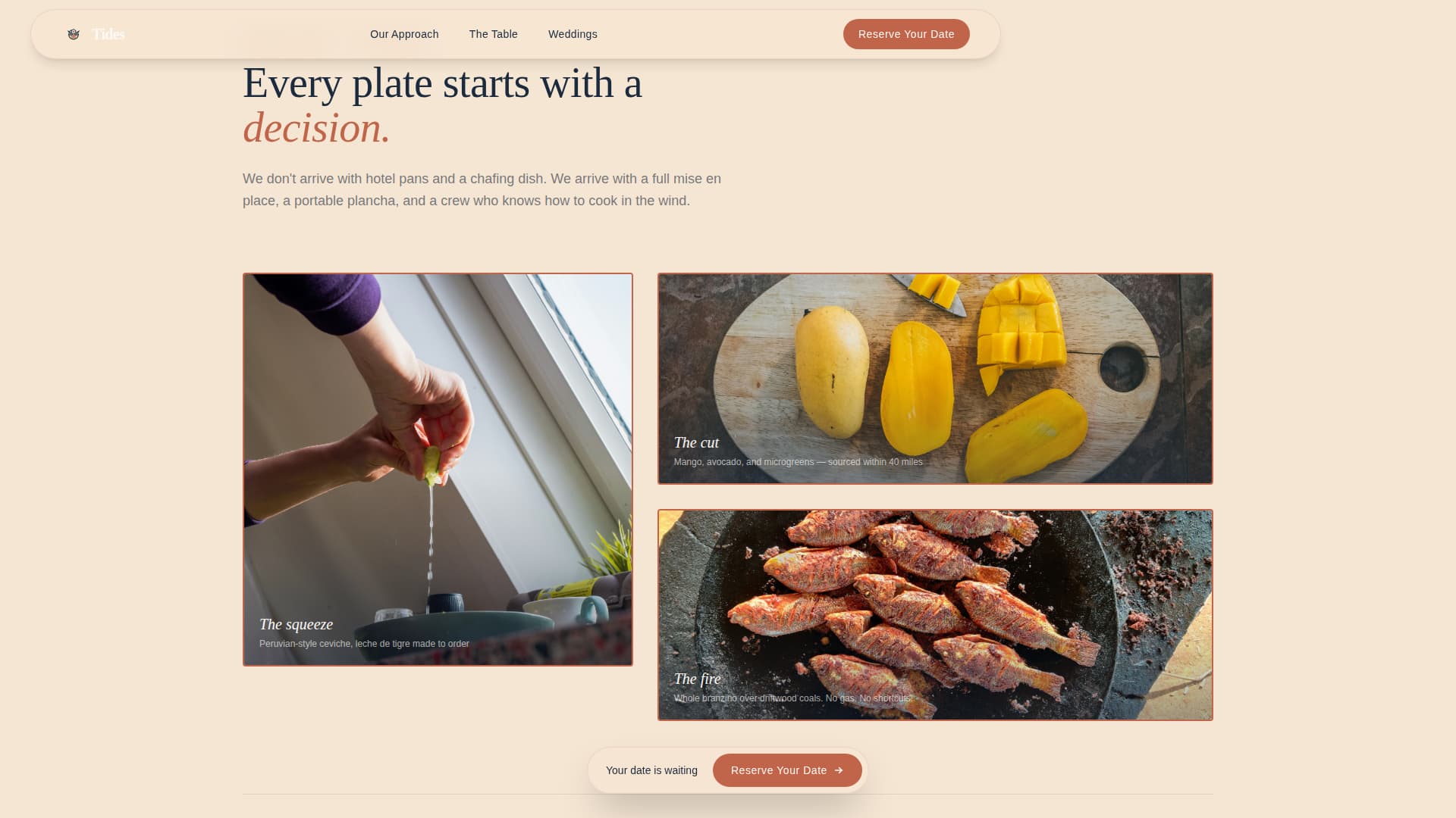 Tides is a single-page booking experience designed for luxury beach wedding catering. It opens with a full-bleed portrait hero and moves visitors through a cinematic scroll that mirrors one golden evening on the shore. The layout earns the inquiry by making the food and setting feel real before a single form field appears.