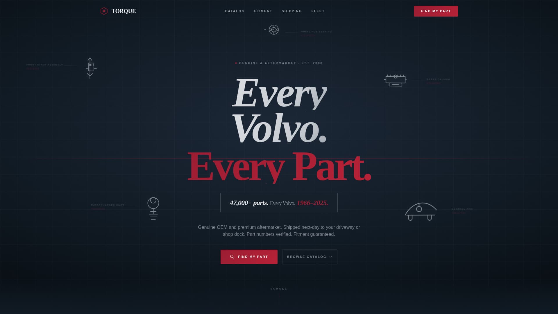 Torque is a single-page gallery and detail landing page for a Volvo parts warehouse. It leads with oversized performance stats, flows into an expandable product grid with fitment detail panels, then closes with a three-step lead generation form and a fleet quote sidebar. Every section earns trust before asking for information.