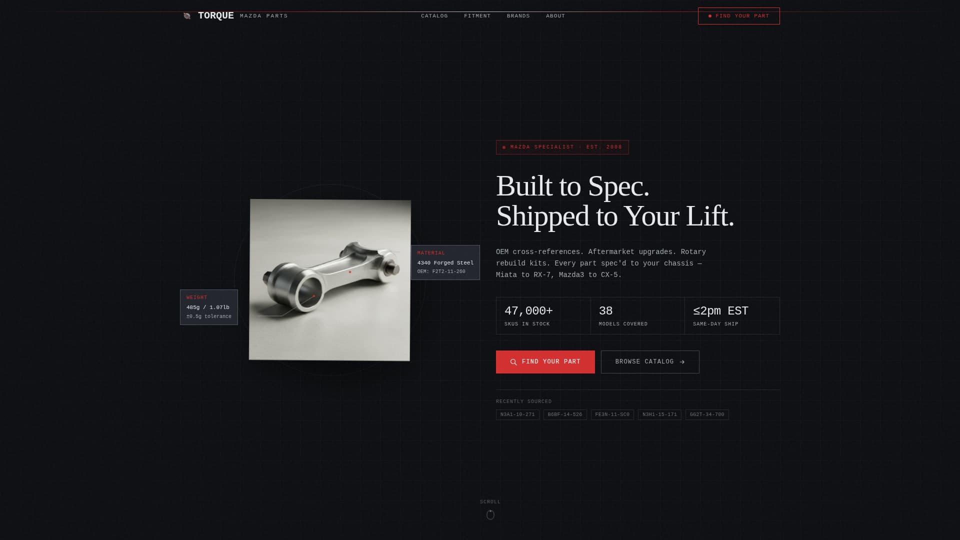 Torque was designed specifically for the Mazda parts and accessories niche, where buyer confidence depends on fitment precision and catalog depth. The template's structure is modeled on how experienced Mazda owners and shop technicians actually research parts.