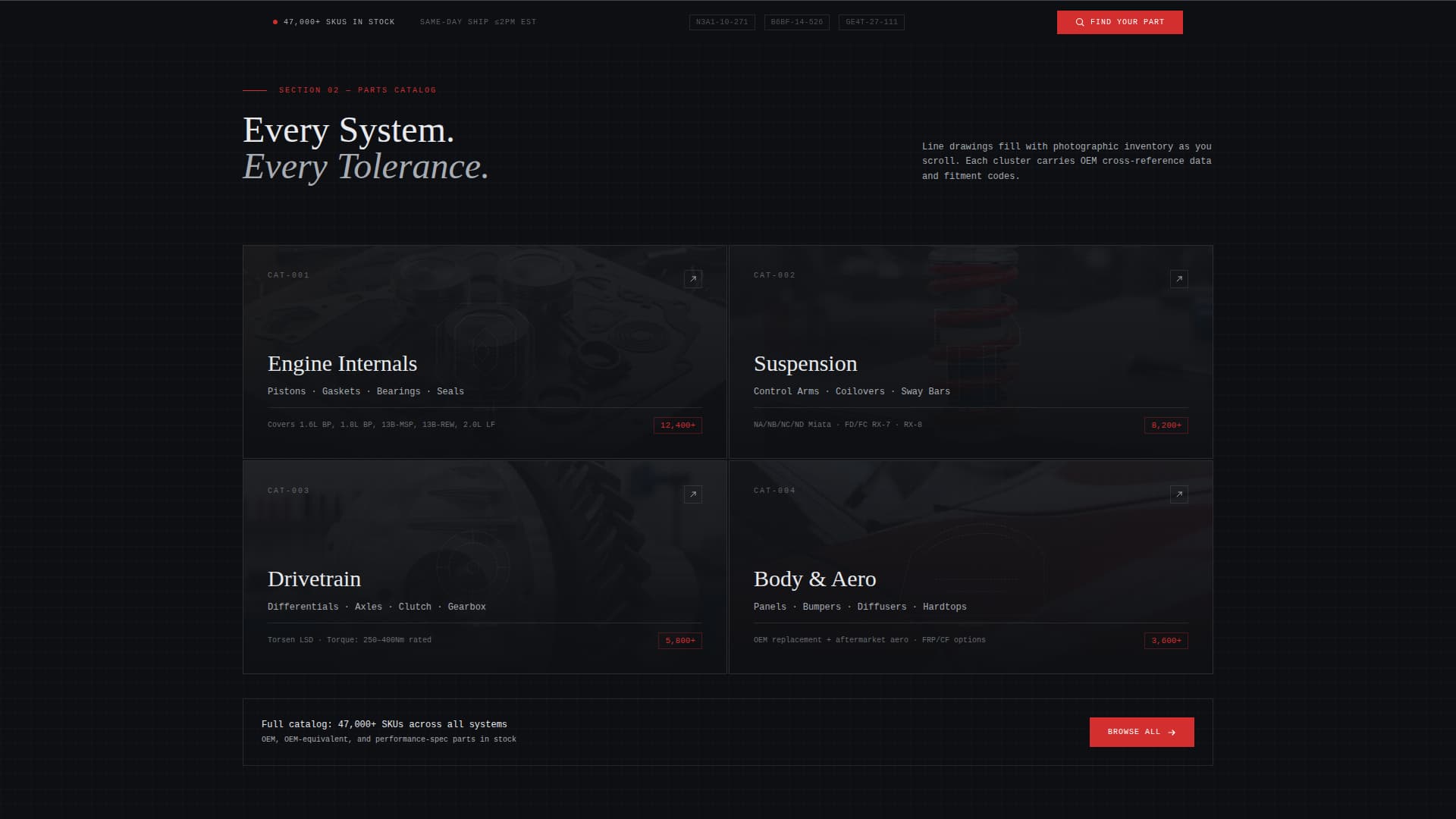 Each section of the page enters the viewport in sequence, behaving like an engineering document being assembled in real time. Top-selling categories including engine internals, suspension, and body panels appear first as technical line drawings. As the visitor scrolls, those drawings fill with photographic detail and fitment data loads in monospaced type alongside each product cluster.