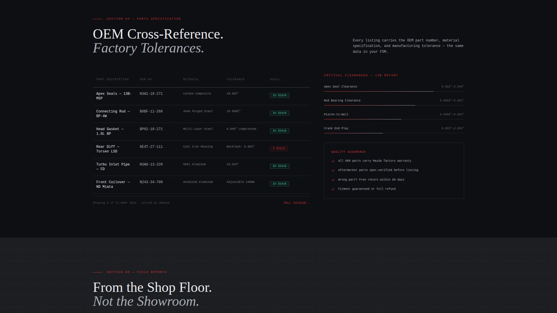 Tolerances, material specifications, and OEM part-number cross-references appear in monospaced type throughout the Spec Sheet sections. This typographic choice reinforces technical authority and makes part data easy to scan, mimicking the formatting of a real parts catalog or factory service document.