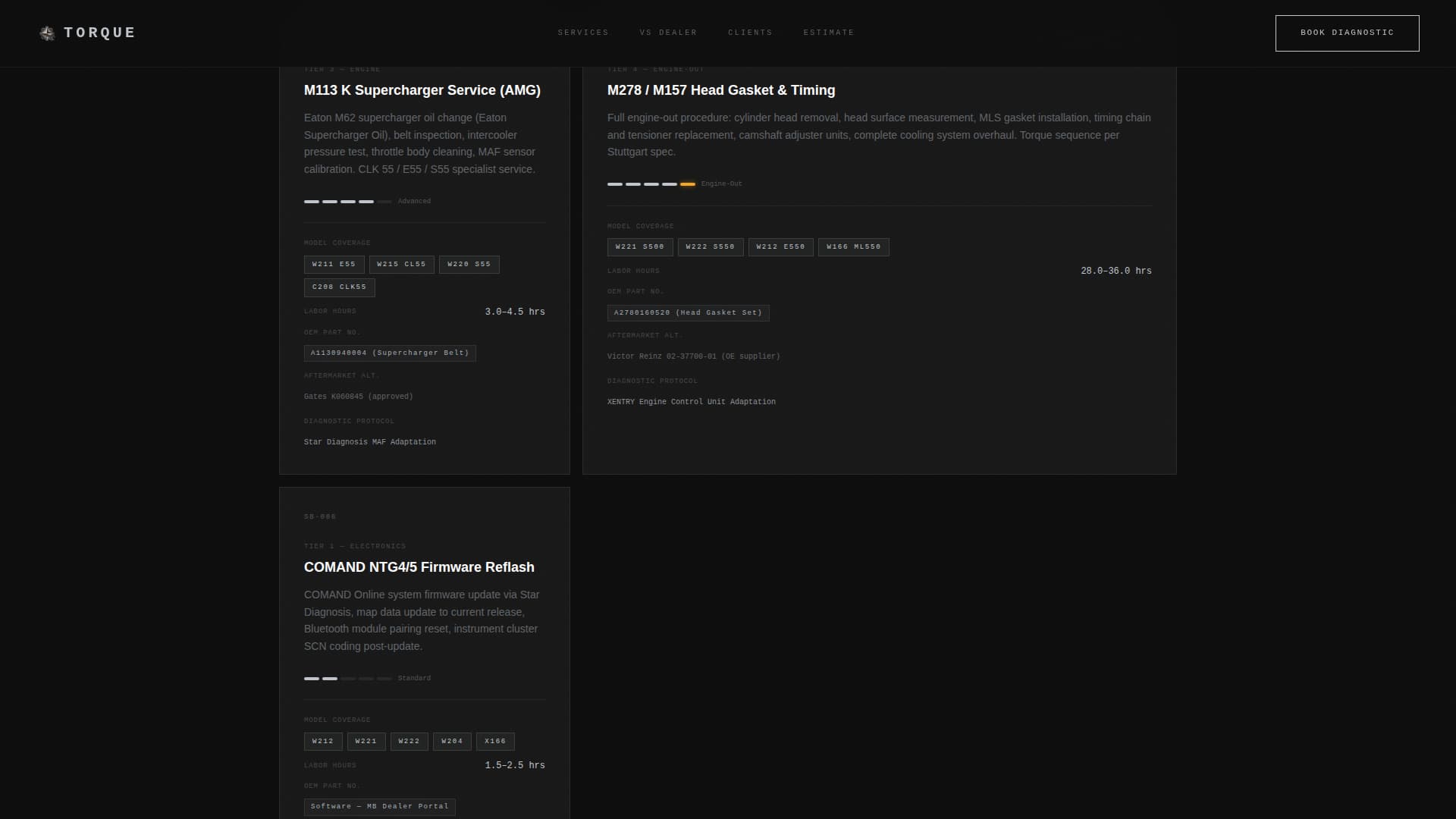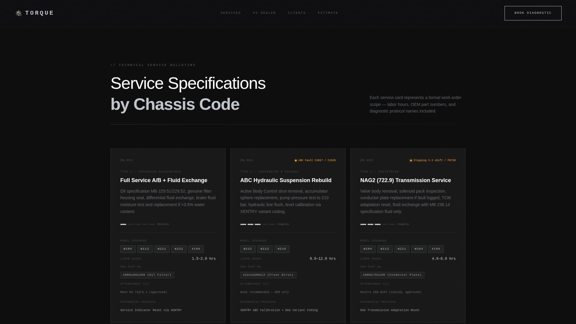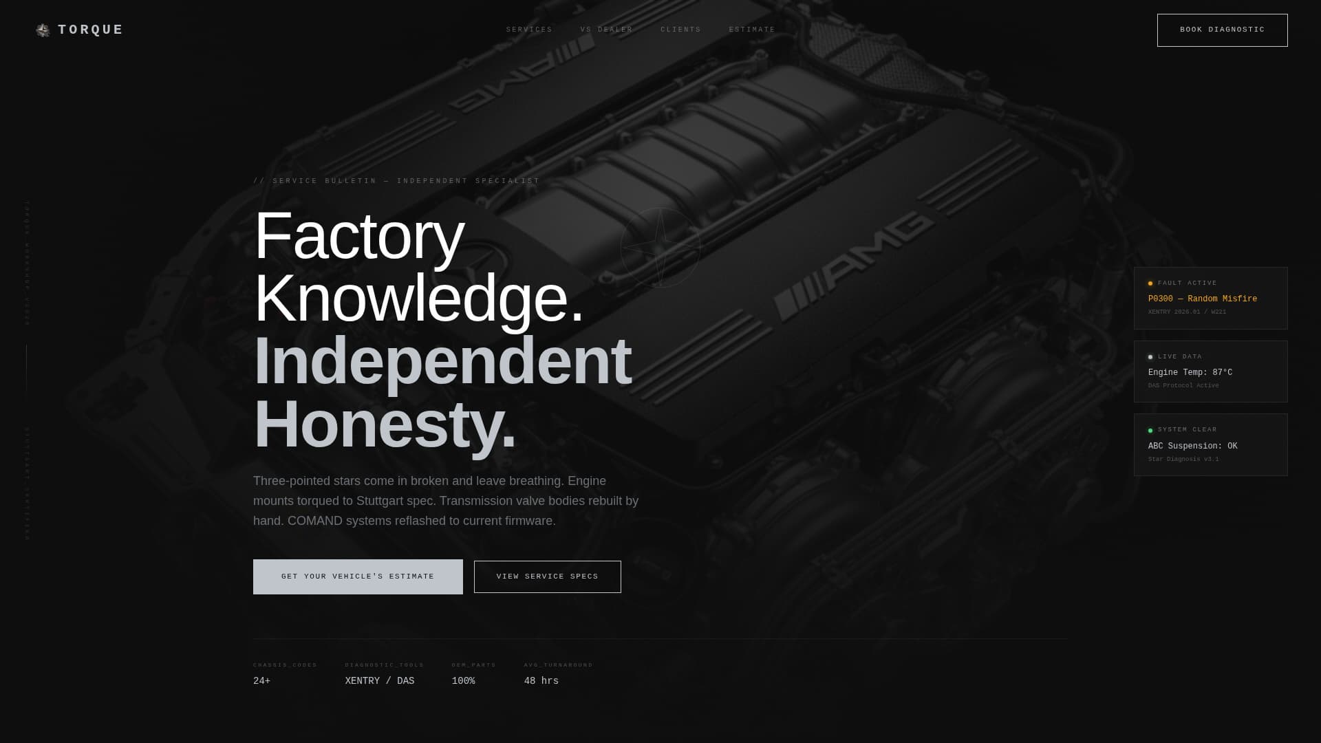 Torque is a single-page landing page template designed for Mercedes-Benz independent specialists. It presents services as structured spec cards, organizes content like a technical service bulletin, and uses a carbon fiber color system to match the precision of the vehicles being serviced. Every section is built to earn trust before asking for a booking.