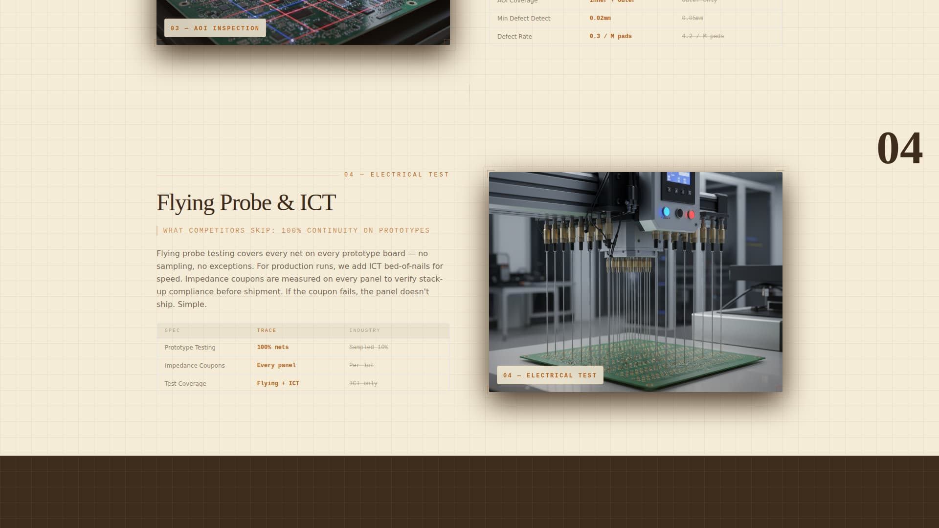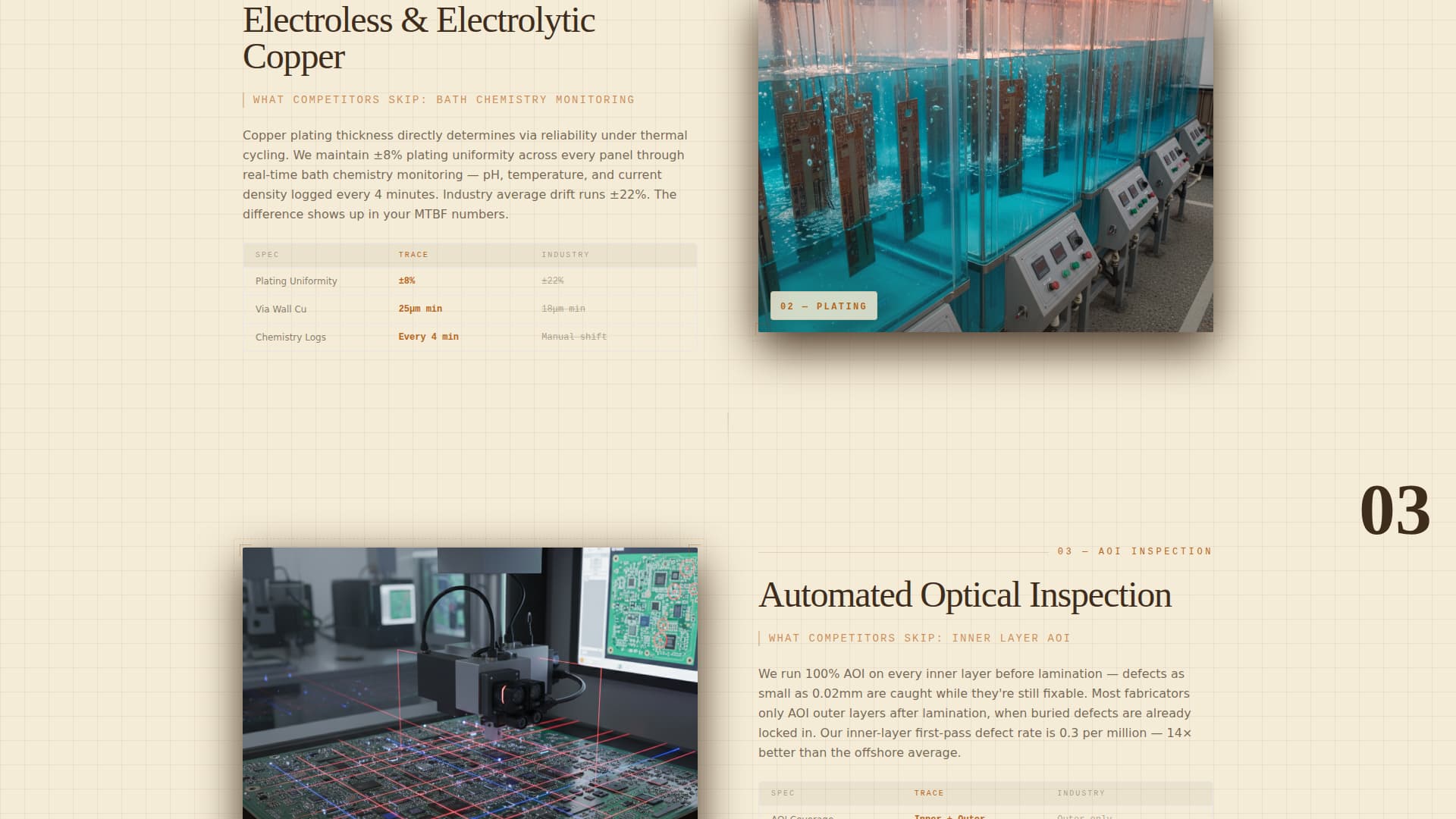 | Process versus. Competitors | Show a drilling or plating stage image alongside copy explaining where competitors cut corners |