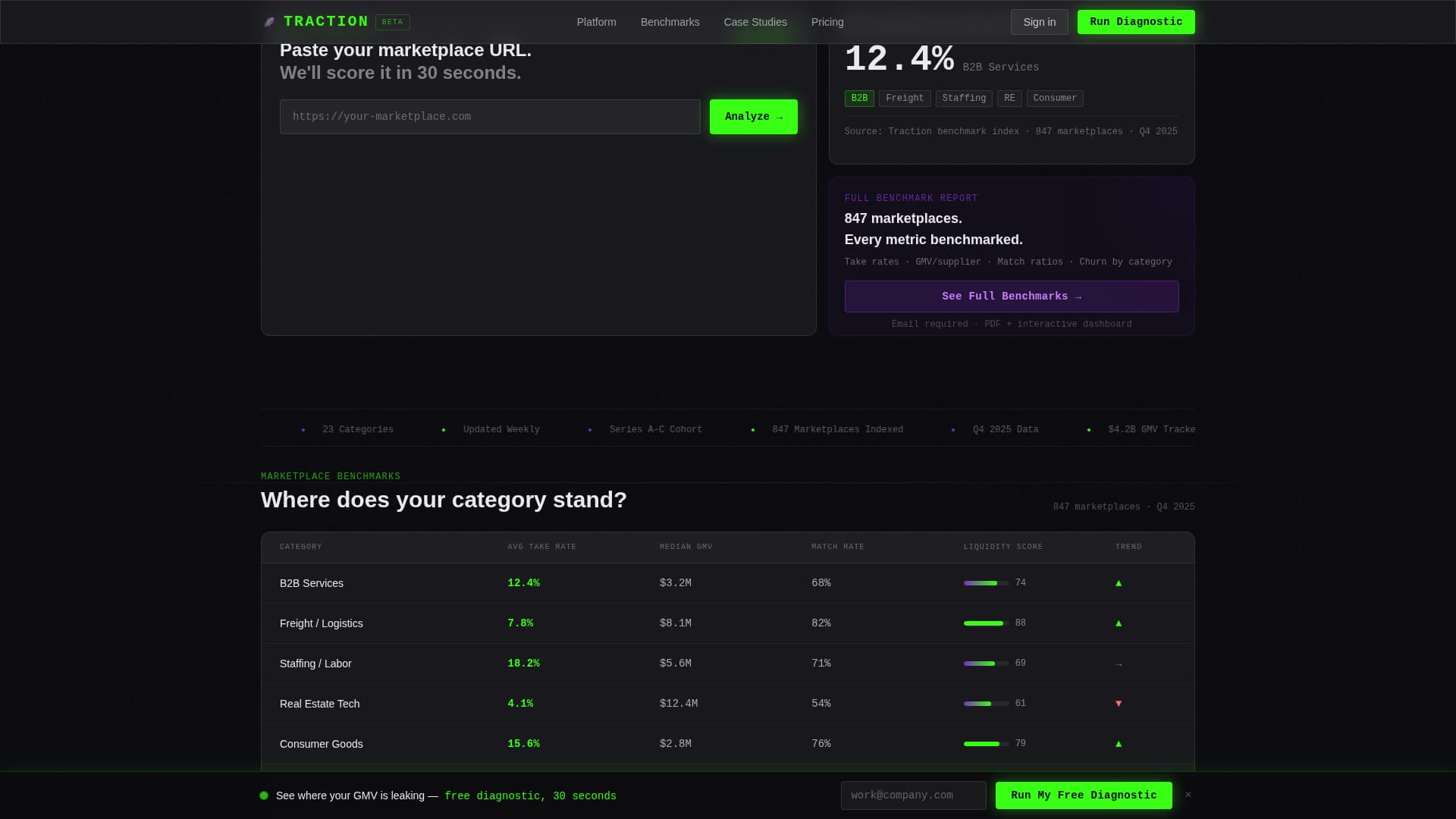 Traction is a single-page bento grid template designed for marketplace growth platforms targeting Series A founders. It leads with interactive tools, a tab-switching hero, a take-rate simulator, and a URL-based liquidity diagnostic, so visitors are using the product before they read a single line of copy. The conversion goal is a freemium "Run My Free Diagnostic" signup.