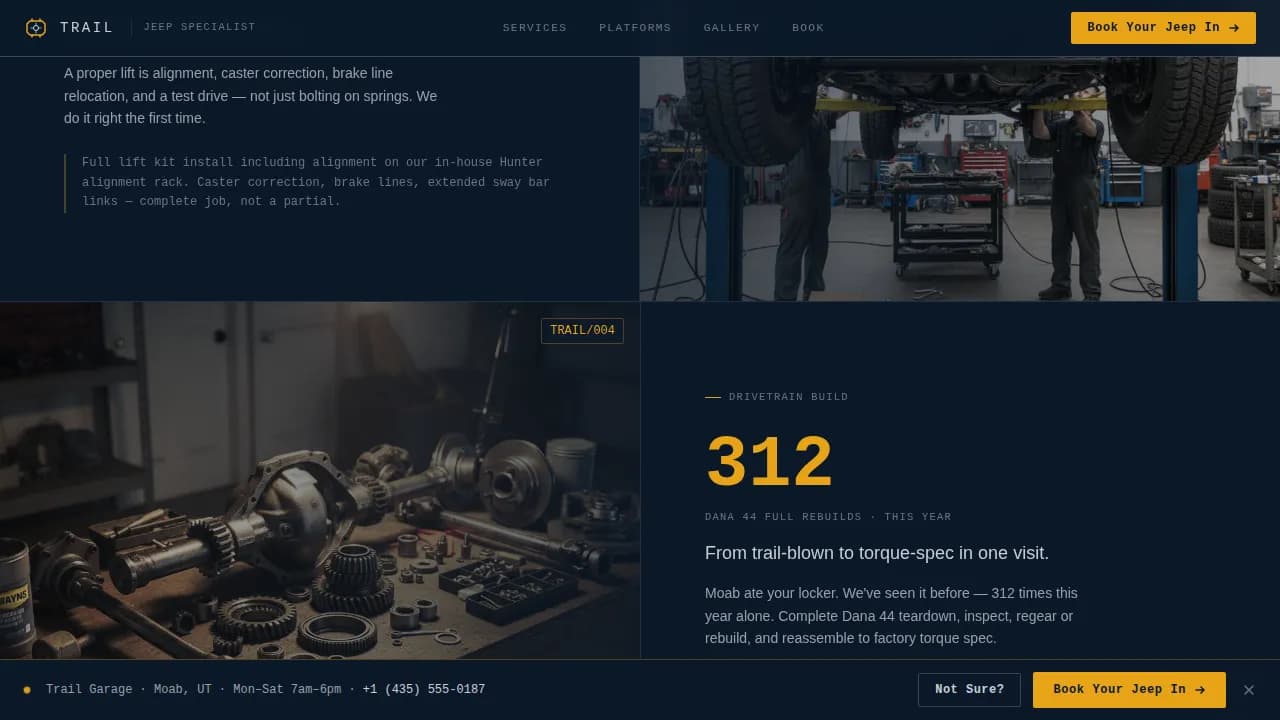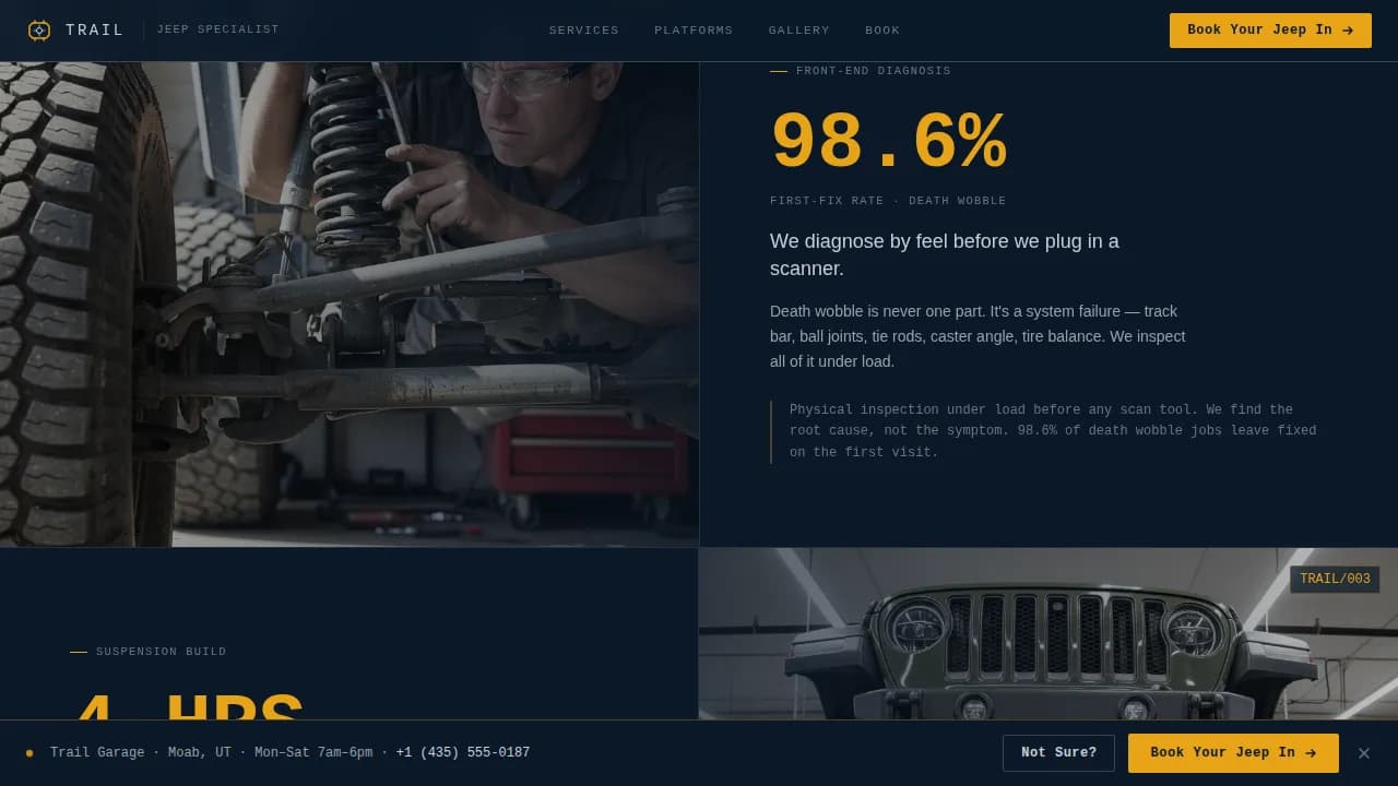 Trail is a precision-built, split-screen (50/50) landing page template for Jeep specialist repair shops. It opens with an interactive drivetrain configurator, escalates trust through hard-number impact sections, and closes with a frictionless booking flow. The design speaks the language of Jeep culture: platform-specific, technically grounded, and built to convert road-worn owners into booked service appointments.