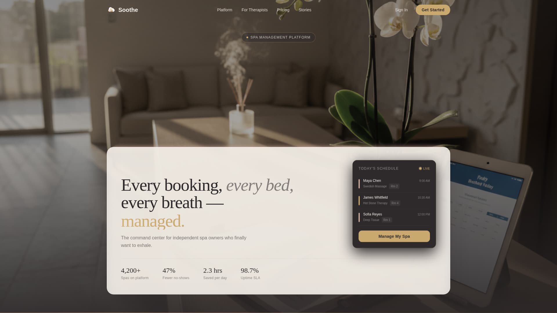 The hero opens with an overhead golden-hour spa photo, lightly desaturated to match the Cloud Canvas tone. A serif-typeface tagline card slides up from the bottom, carrying the line "Every booking, every bed, every breath, managed." No headline competes with the image on the first beat.