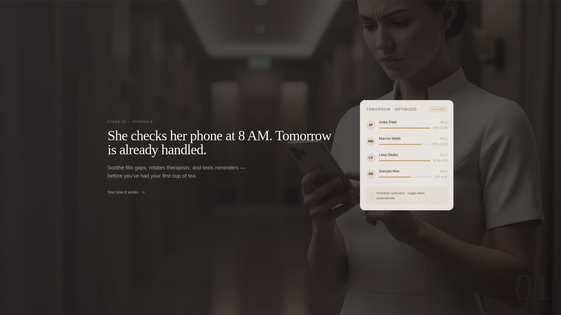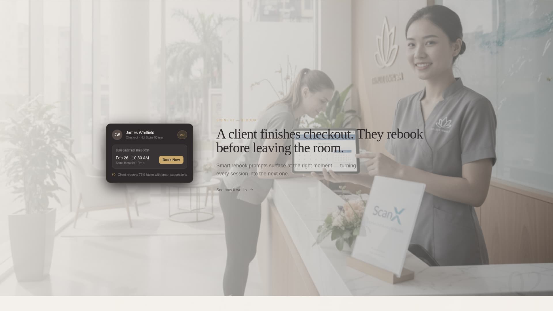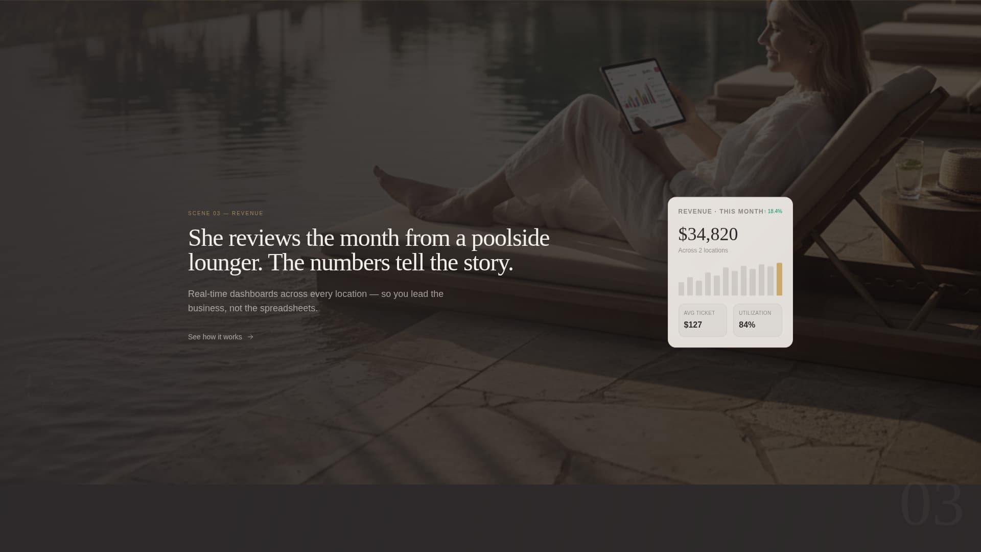 Three full-viewport panels follow the hero, each with a parallax photo underneath and a translucent user interface overlay. Scene one shows a therapist viewing an optimized schedule. Scene two shows a client rebooking mid-checkout. Scene three shows an owner reviewing revenue dashboards from a poolside setting. The pacing slows as the page descends, mirroring the deceleration of a real spa visit.