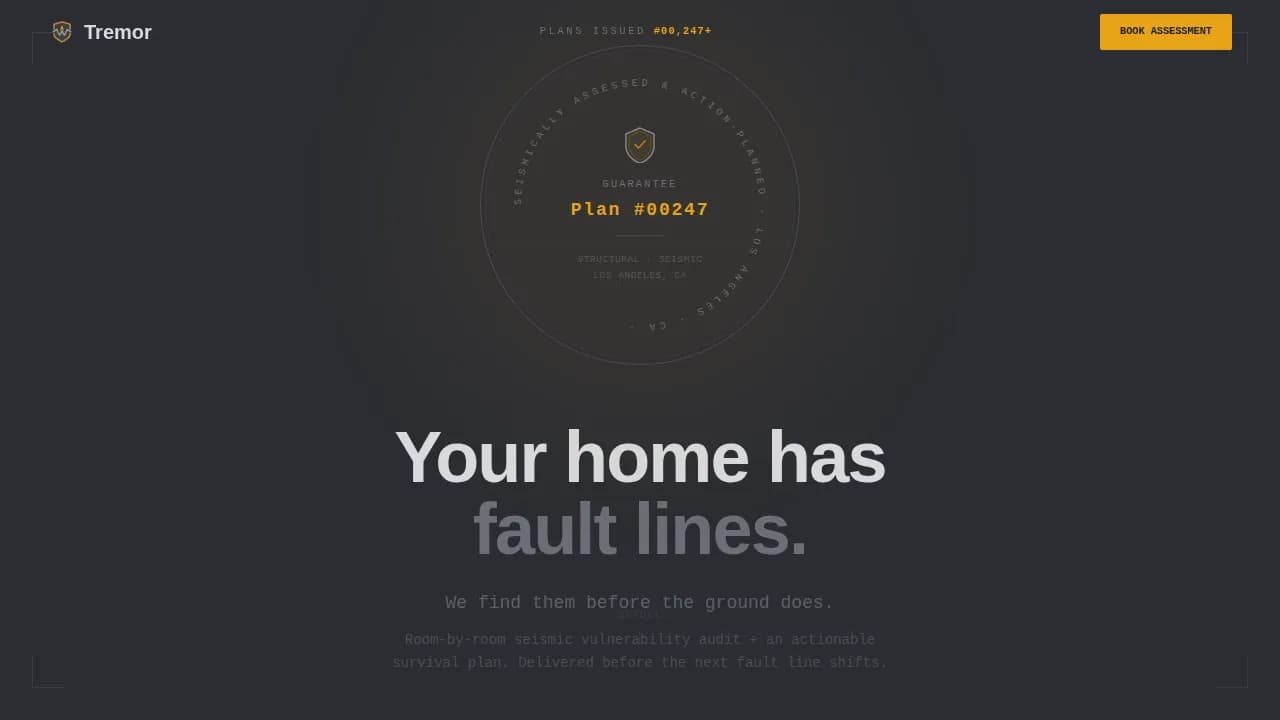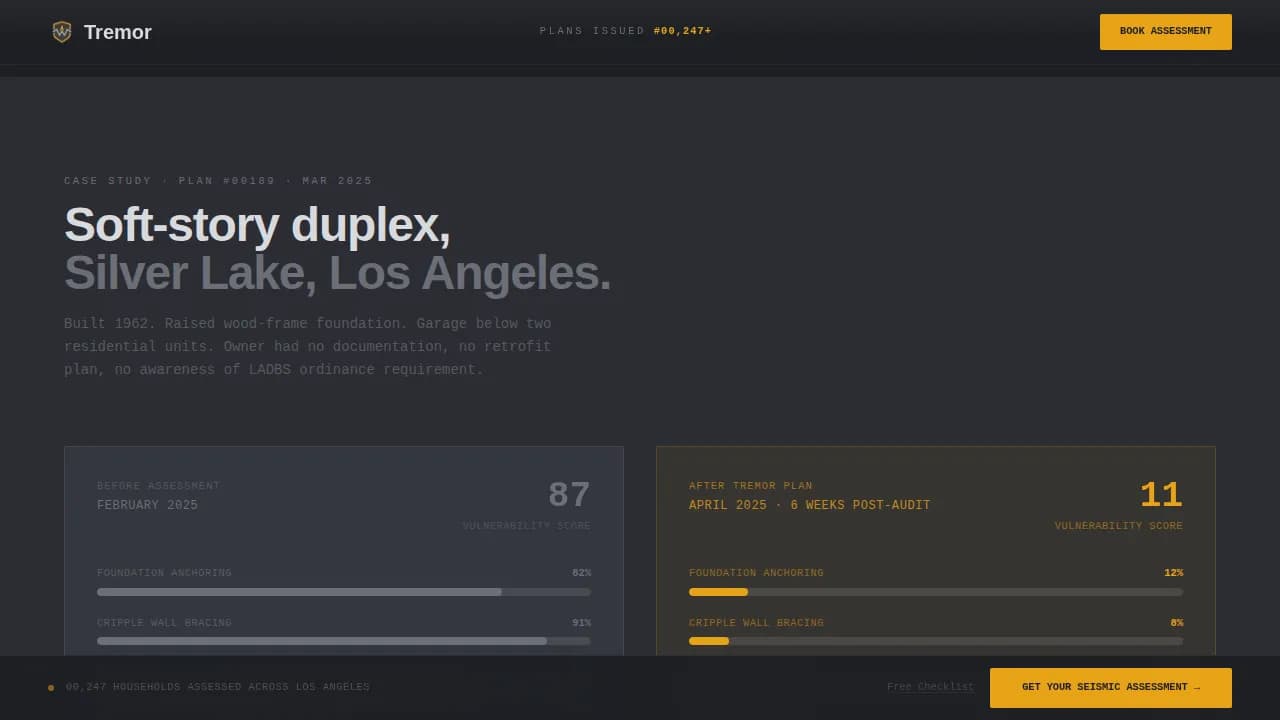 Tremor is a single-page, click-through landing page template for seismic vulnerability assessment services. It pairs a monochrome steel visual system with a problem-to-solution comparison table that escalates from inconvenience to life-safety. The page is built to convert homeowners, property managers, and school administrators into booked assessments with minimal friction.