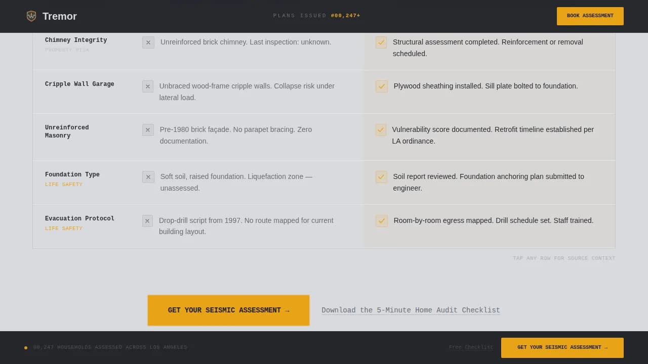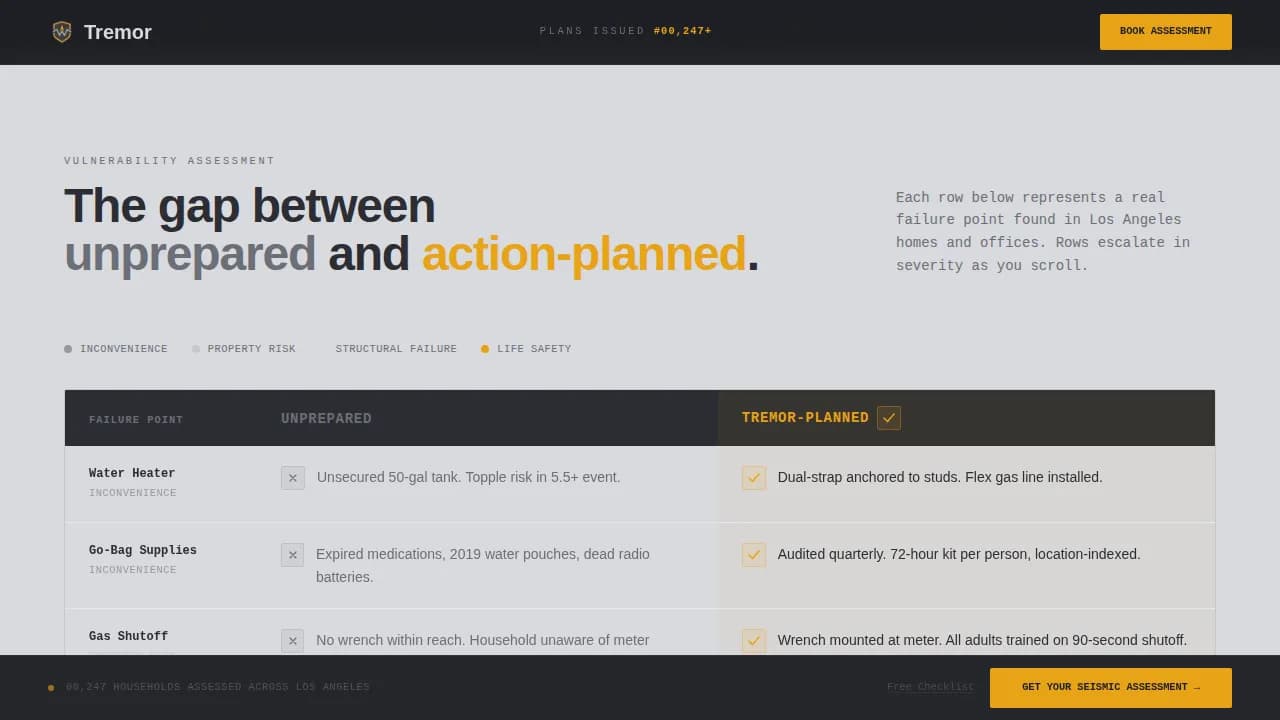 Tremor is a comparison-table landing page template built for earthquake preparedness services. It uses a fire-station visual authority to contrast unprepared households against assessed and action-planned ones. Designed for Los Angeles seismic markets, it drives visitors toward a booked assessment through a sticky call-to-action, a scroll-triggered comparison table, and a secondary checklist capture for undecided visitors.