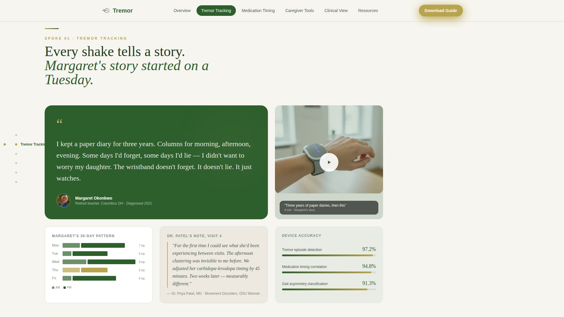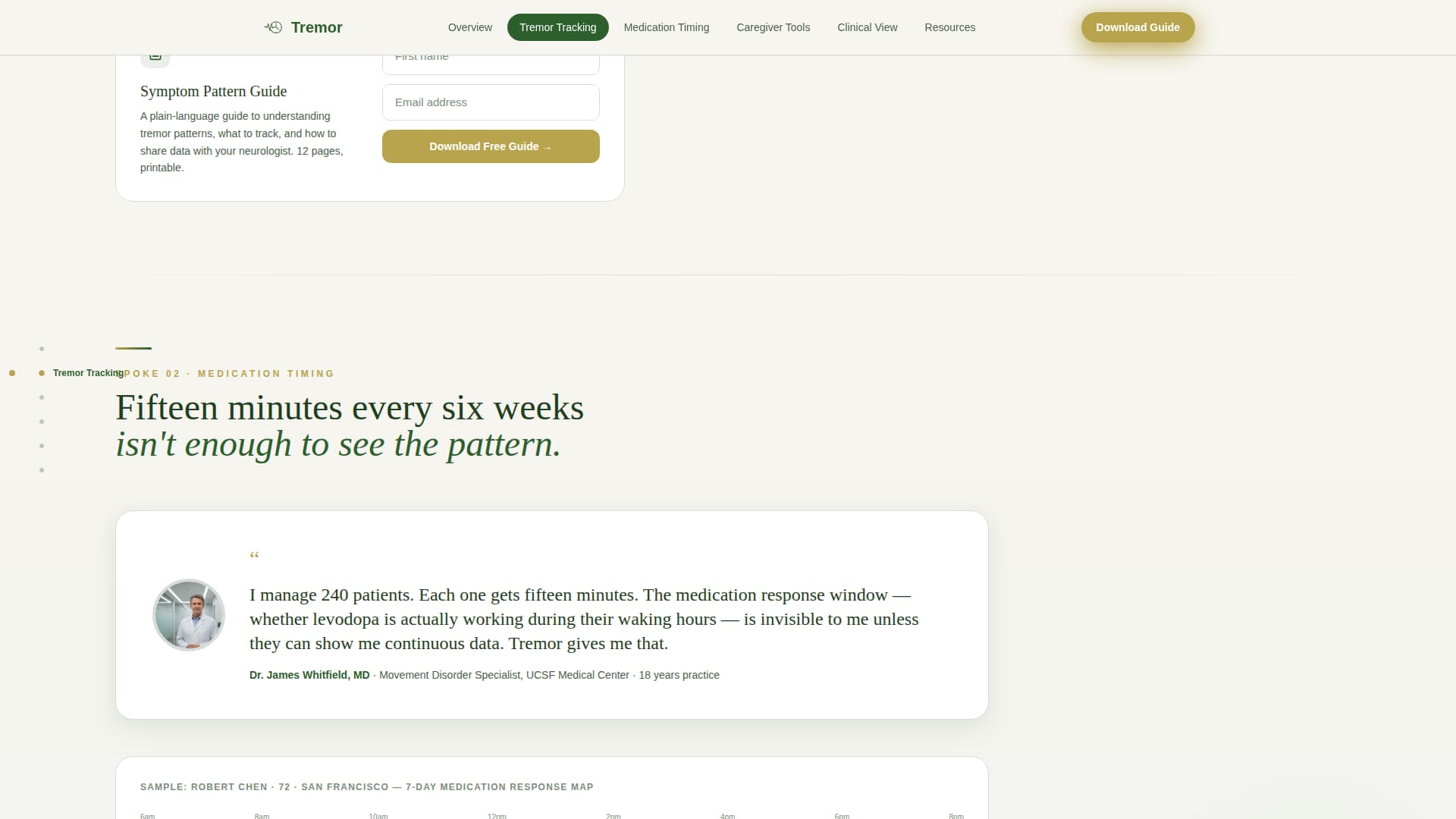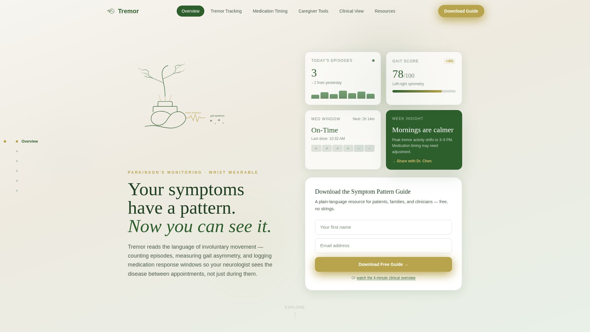 Tremor is a single-page, anchor-navigated landing page template for a Parkinson's disease wearable device. It blends warm educational design with story-driven sections to build trust across three distinct audiences. The conversion goal is simple: a first name and email in exchange for a downloadable Symptom Pattern Guide. No pricing, no purchase flow.