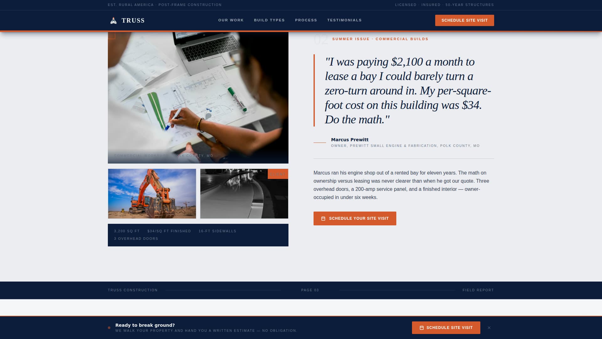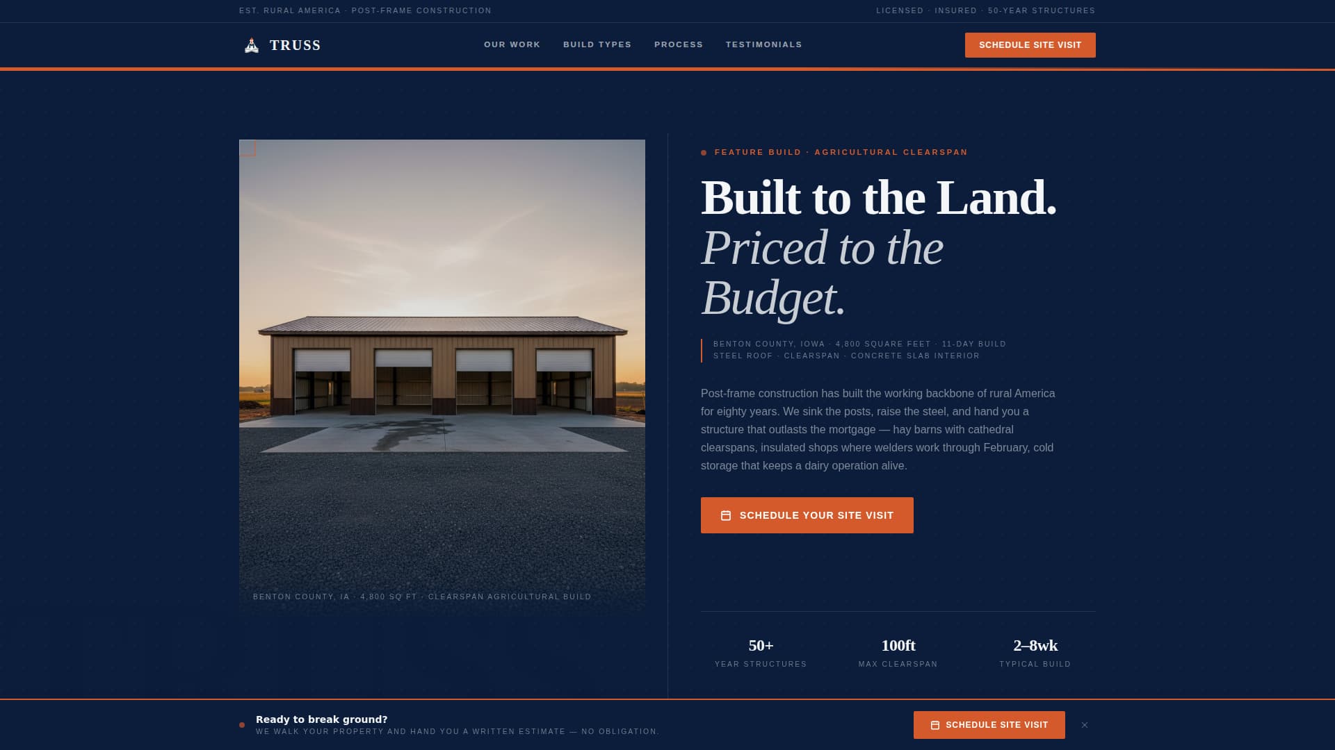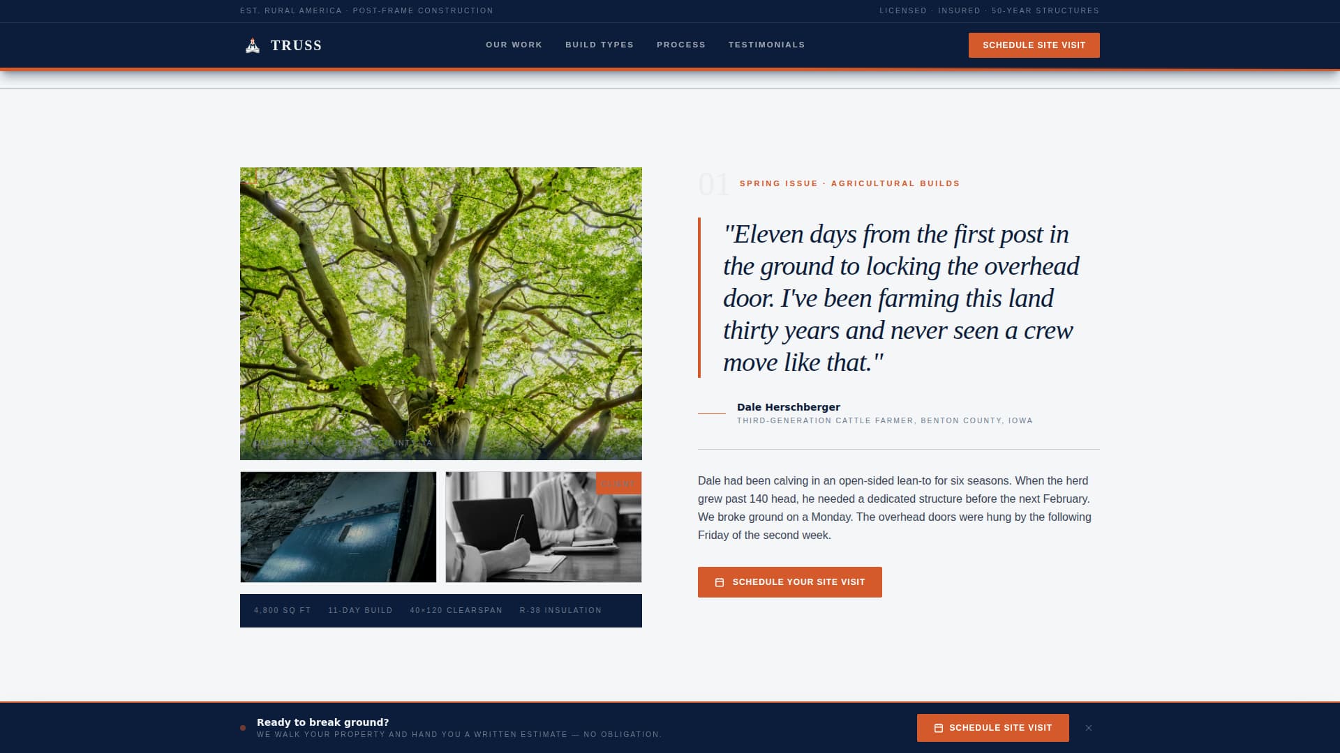 Truss is an editorial magazine-style landing page built for post-frame construction companies. It combines cinematic split-hero photography, testimonial spreads styled like trade-magazine features, and a three-question scheduling form to turn site visitors into booked site visits. The layout earns trust the way a contractor's journal does: unhurried, authoritative, and built around real project stories.