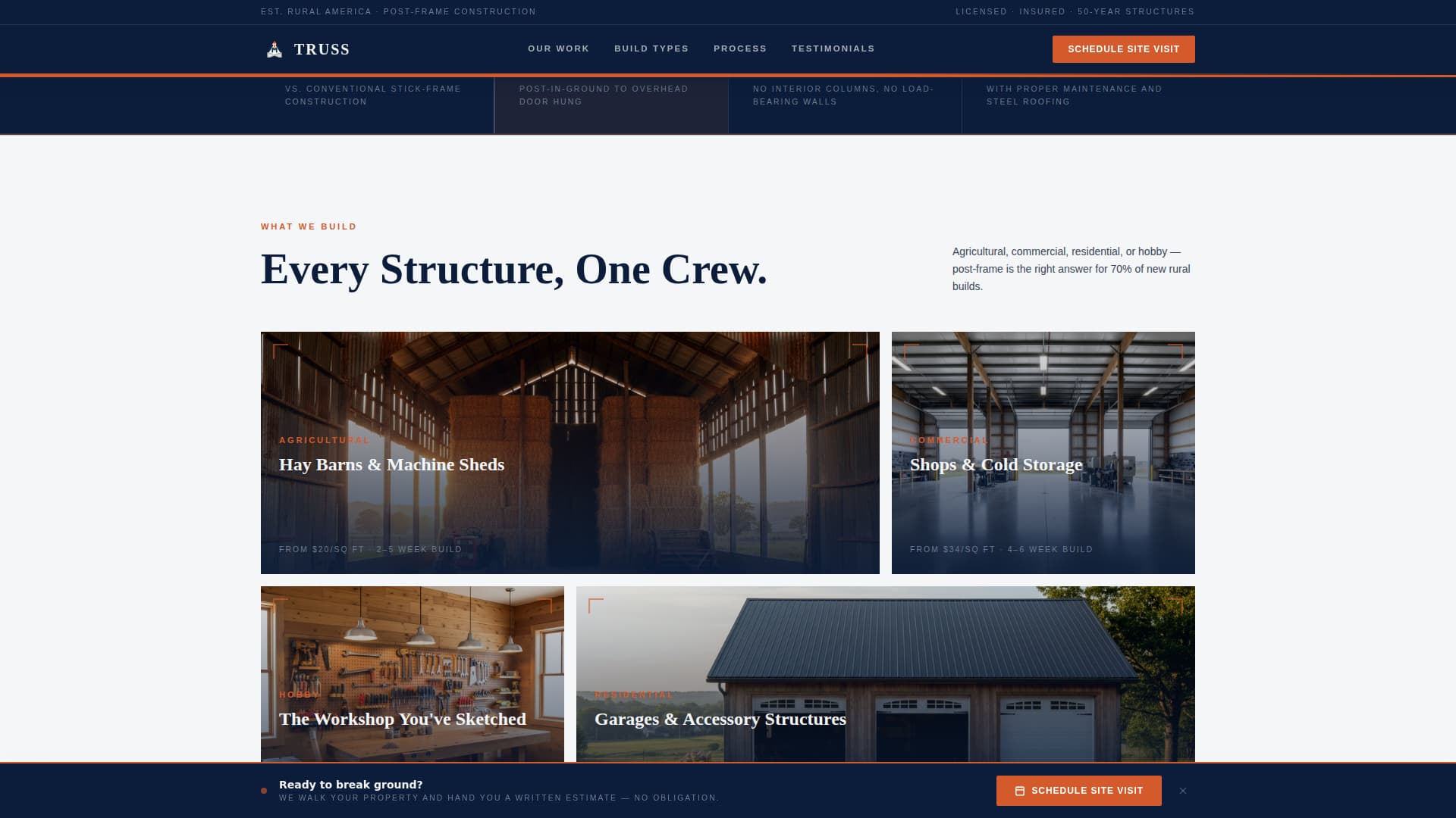This template is built for post-frame and pole barn construction companies that serve rural and agricultural clients. If your business earns its reputation on job sites rather than in showrooms, Truss speaks your language.