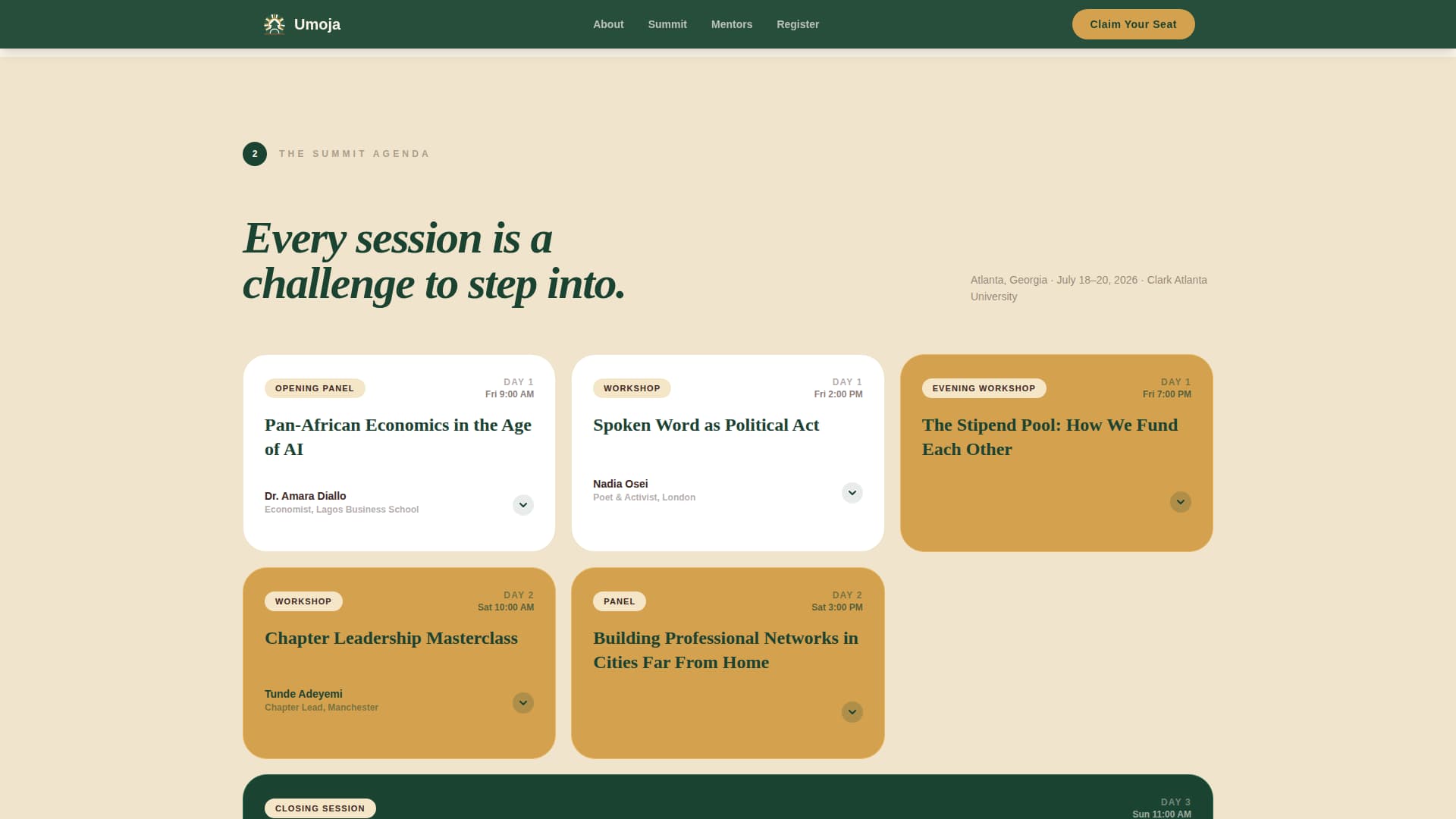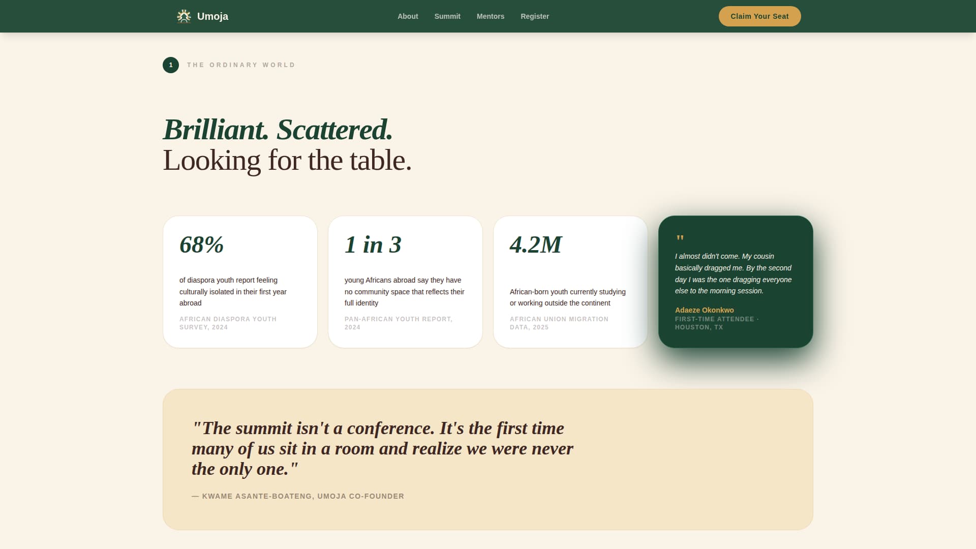 Umoja is a single-page event registration template for African diaspora youth organizations. It uses a modular card grid to guide visitors through a Hero's Journey narrative, opening with community context, building through the summit agenda and mentor spotlights, and landing on a full-width registration card. The result feels less like a sign-up form and more like a seat being pulled out for you.