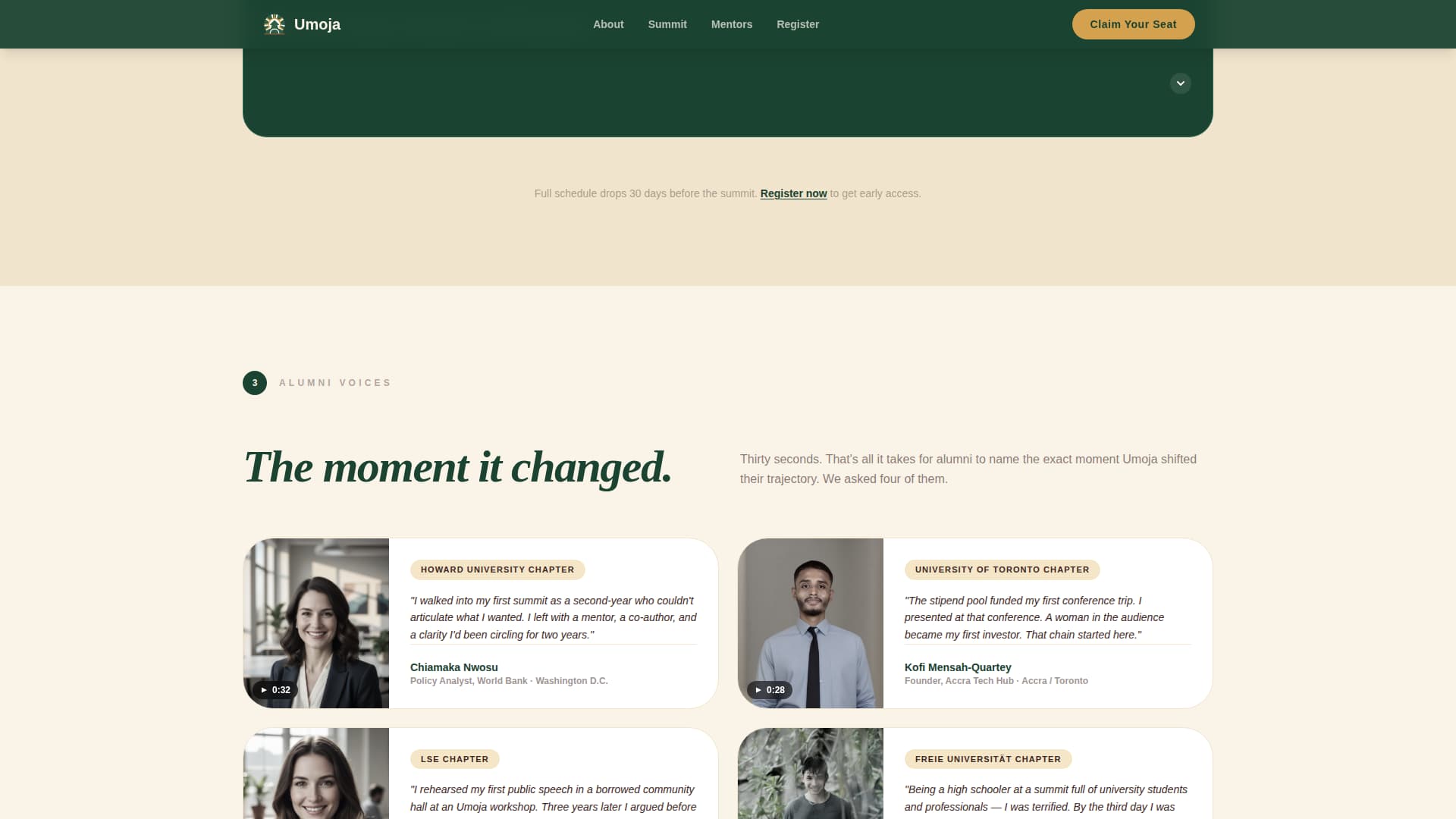 Alumni testimonial cards include a photo, a short quote, and a thirty-second clip indicator. These cards appear midway through the scroll at the point where a visitor needs social proof most. The clips and quotes are designed to describe a turning point, not a resume highlight.