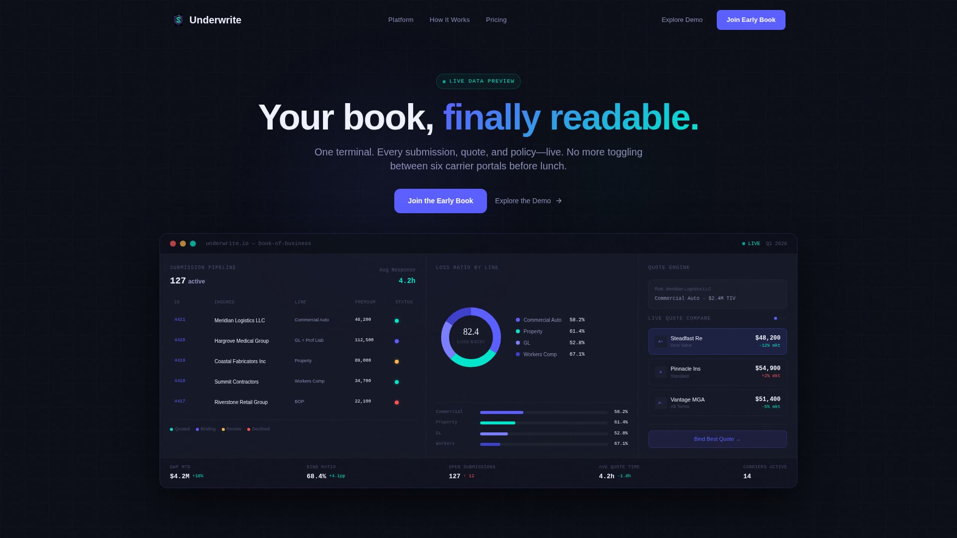 The header section embeds a functioning micro-dashboard directly in the viewport. It displays a live submission pipeline on the left, a donut chart breaking down loss ratios by line of business, and a quote comparison card mid-animation. Visitors can hover cells and toggle between carrier panels before reading a single line of copy.