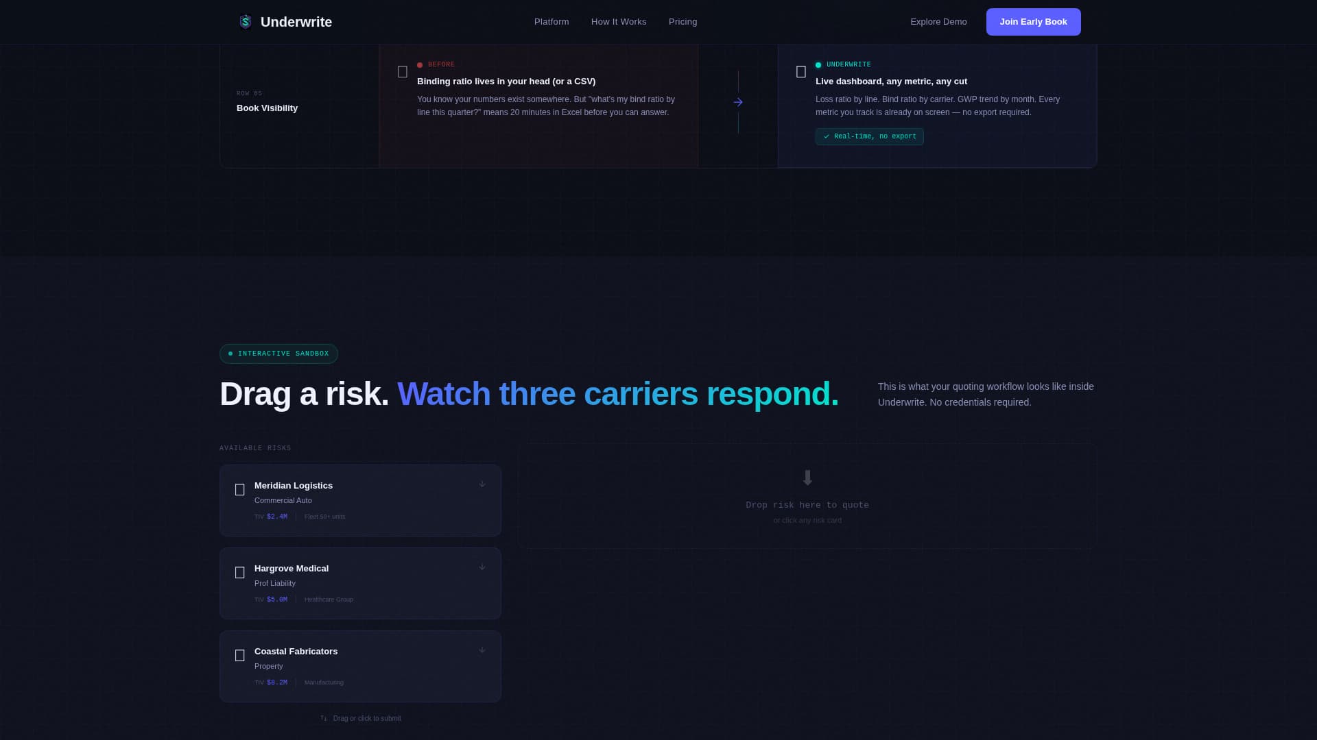 Below the comparison table, visitors can drag sample risks into a quoting engine and watch three carrier responses populate side by side. This sandbox lets prospects interact with the core product mechanic without creating an account.