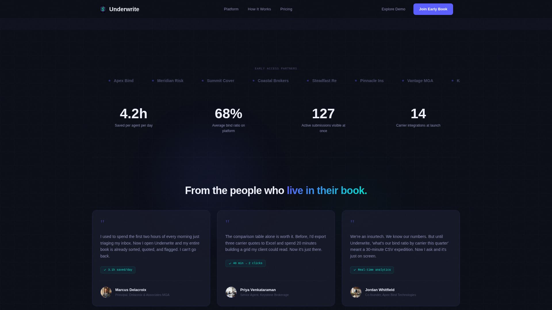 Insurance workflows are fragmented. Submissions arrive by email, quotes travel as PDFs, and binding decisions live inside separate carrier portals. A coming soon page for a product solving this needs to demonstrate the problem and the solution before asking for a signup.