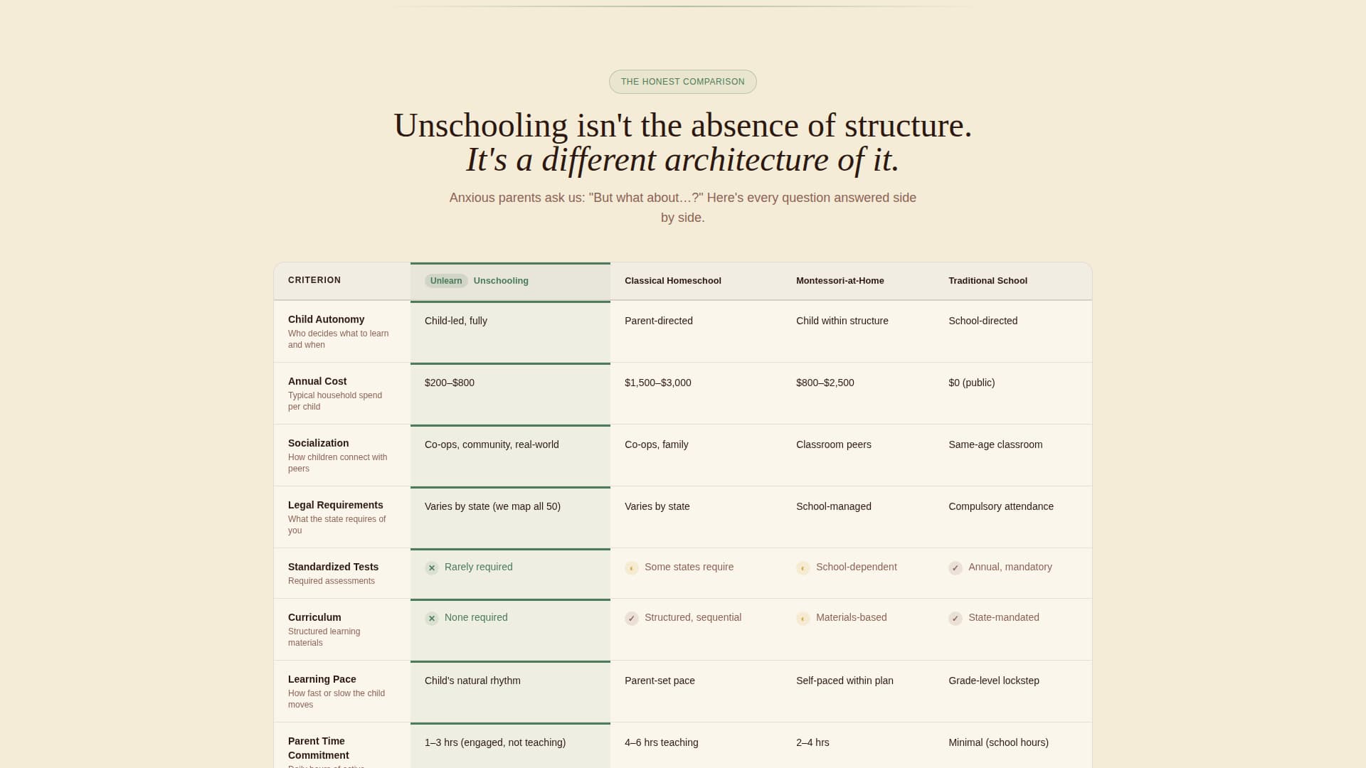A structured table places unschooling next to classical homeschooling, Montessori-at-home, and traditional school. It compares four dimensions: autonomy, cost, socialization, and legal requirements. This layout helps anxious parents see that unschooling is a different architecture of learning, not the absence of one.
