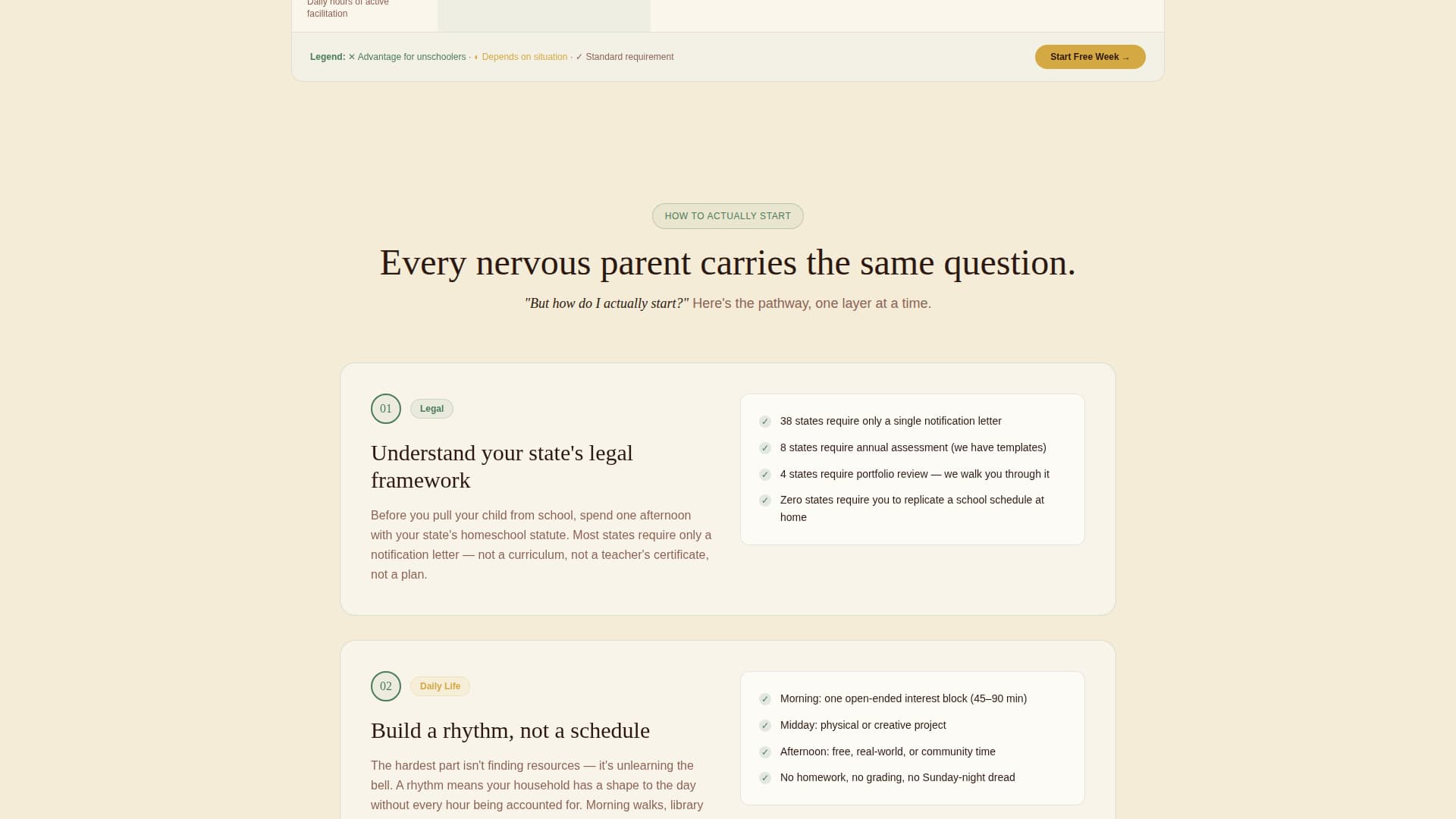 | Step 2: Daily Rhythm | Shows how to build a daily rhythm without a fixed schedule or curriculum |