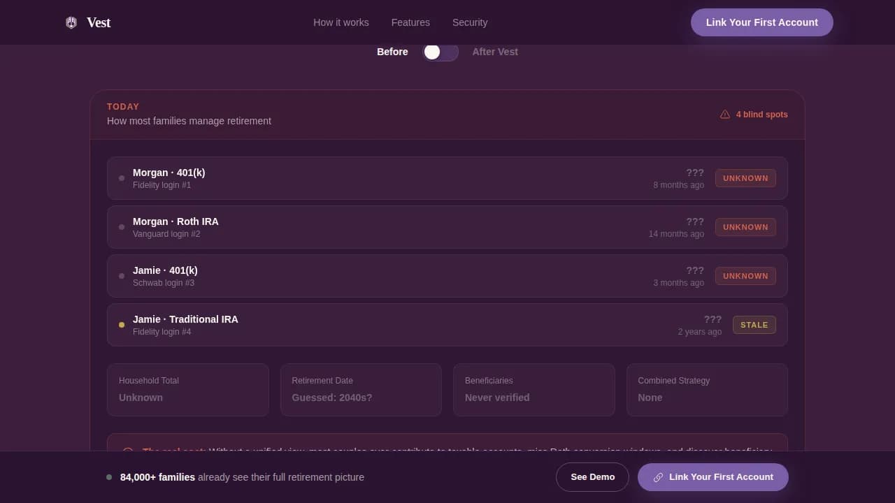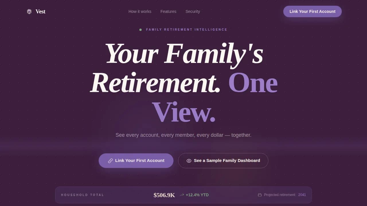 The Vest Family Retirement Planning landing page template is a dashboard-style, single-page lead generation layout built for joint and family retirement account platforms. It uses a deep plum and champagne color system, animated data grids, Before/After comparison panels, and a progressive three-step sign-up form to help families see every retirement account on one unified screen and take action together.
