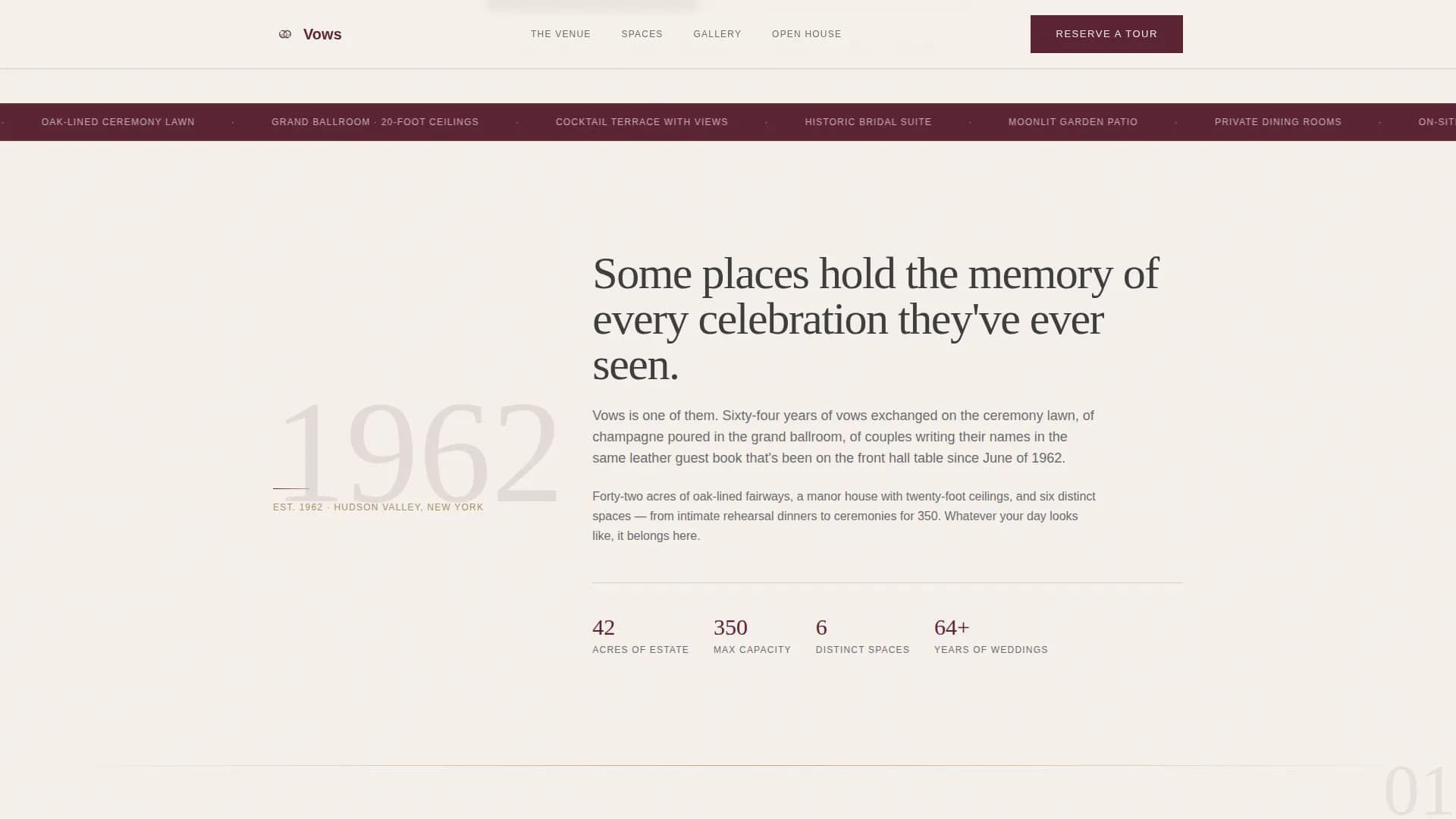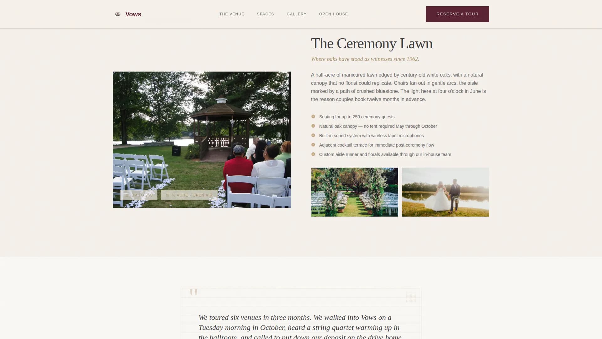 Most venue websites ask couples to commit too soon. A contact form appears before the space has been felt, the scale understood, or the atmosphere trusted. Couples click away. Vows solves this by letting the photography and scroll sequence do the persuading first, so the form arrives when the visitor is already picturing their wedding there.