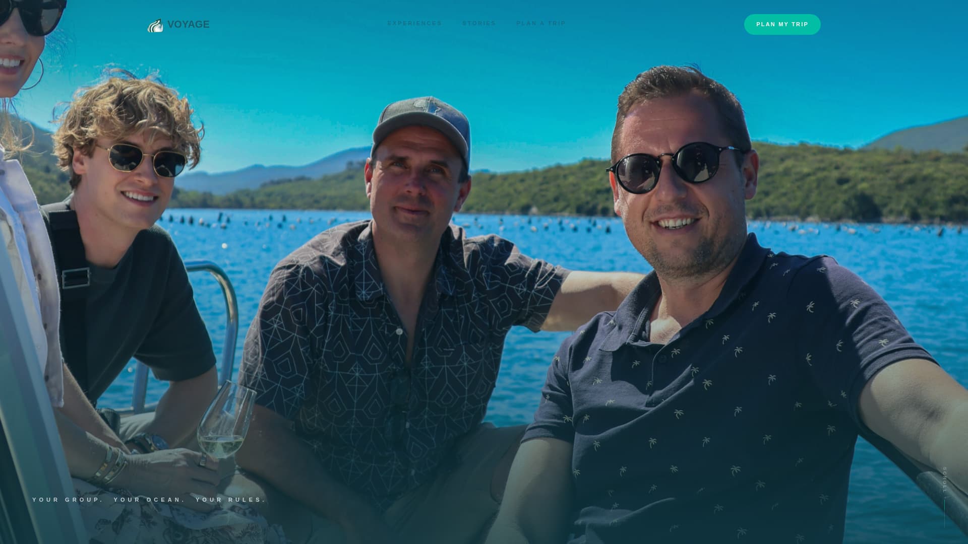 The header uses a wide-format, golden-hour lifestyle photograph of a group mid-laugh on a traditional dhoni. A single line of thin, tracked-out uppercase type floats at the bottom of the image. There is no button in the hero, the image breathes on its own and draws visitors forward through curiosity rather than pressure.