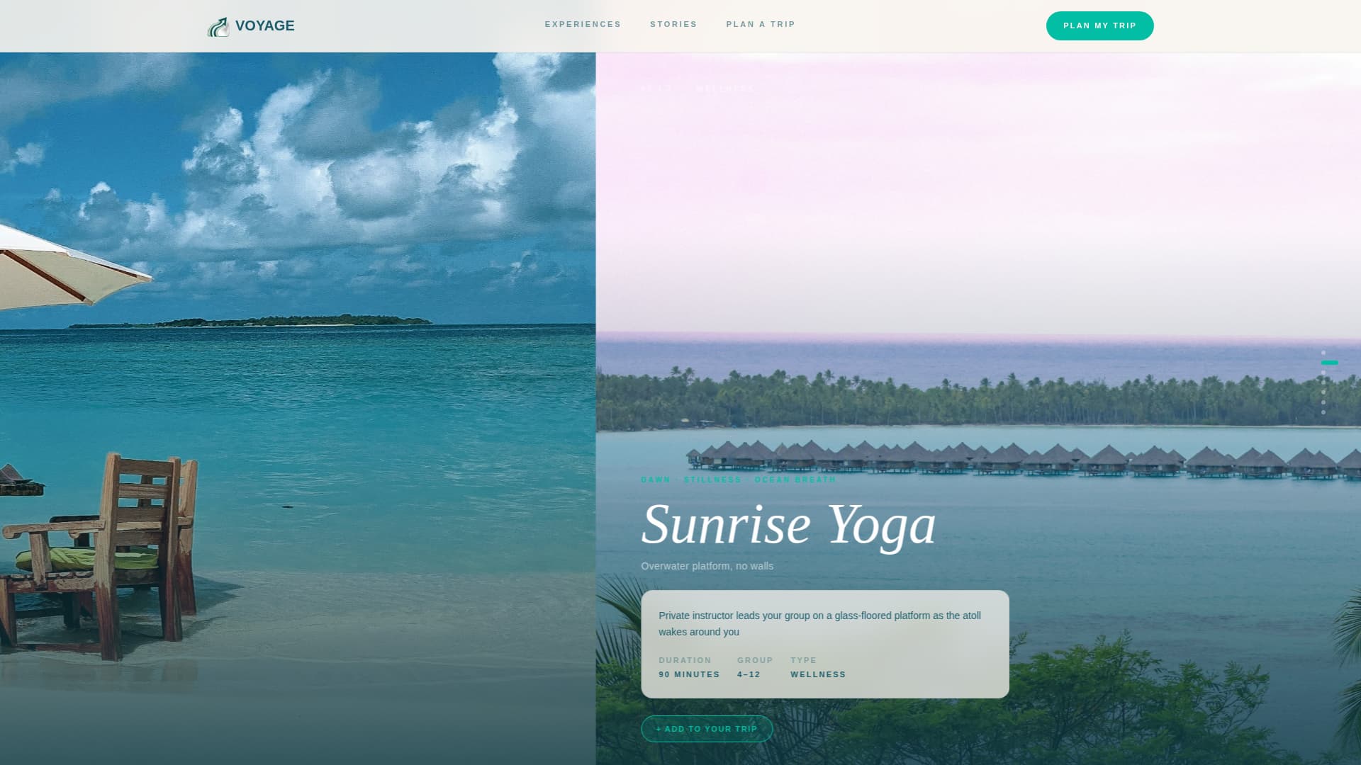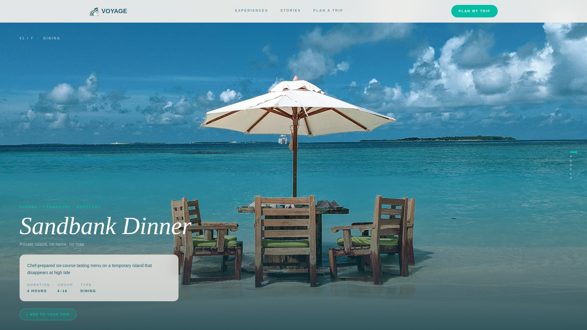 Voyage is a single-page, horizontal-scroll template designed for a boutique Maldives group tour operator. Visitors island-hop through seven full-bleed experience panels, build a personal itinerary along the way, and arrive at a short group planning form already invested in the trip. The template balances editorial luxury with practical conversion mechanics.