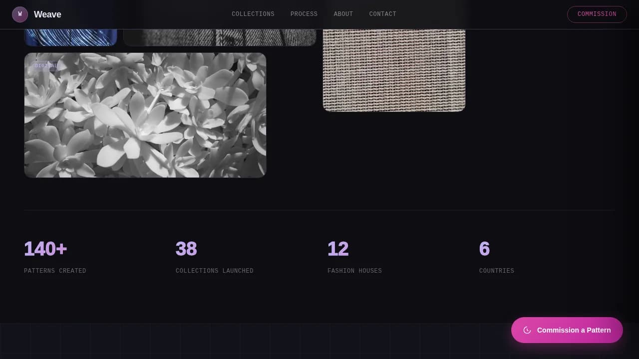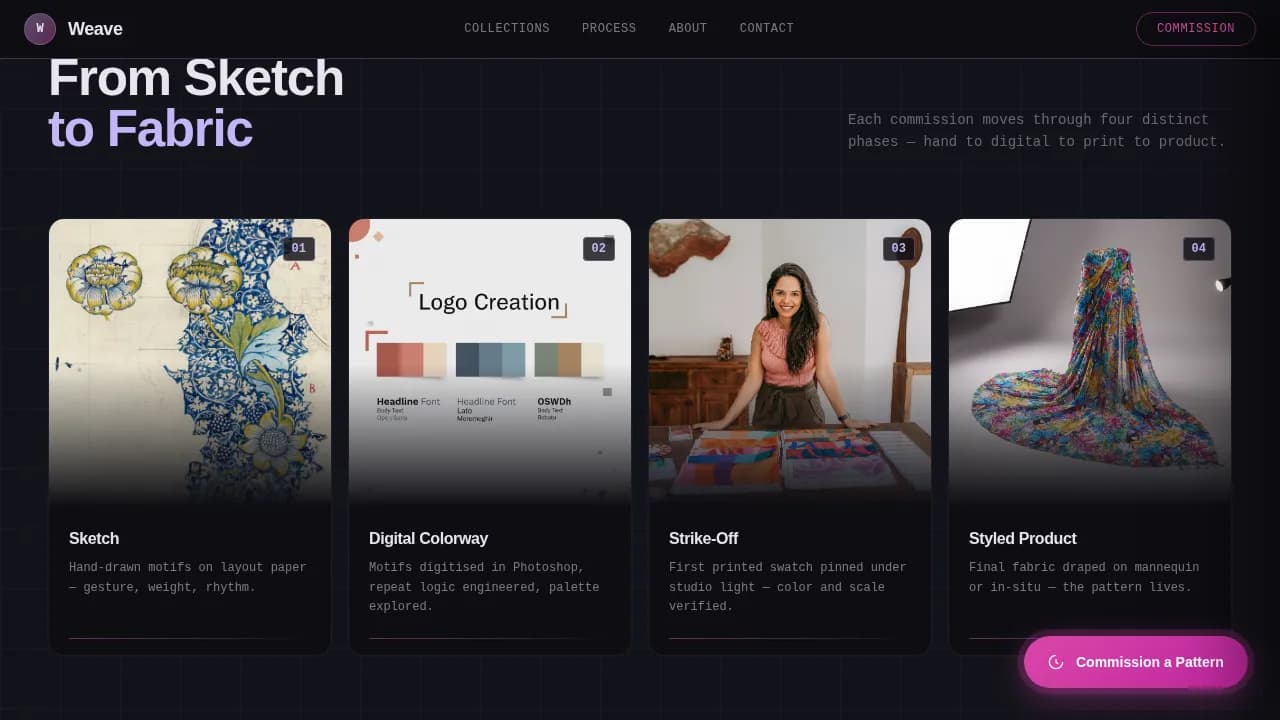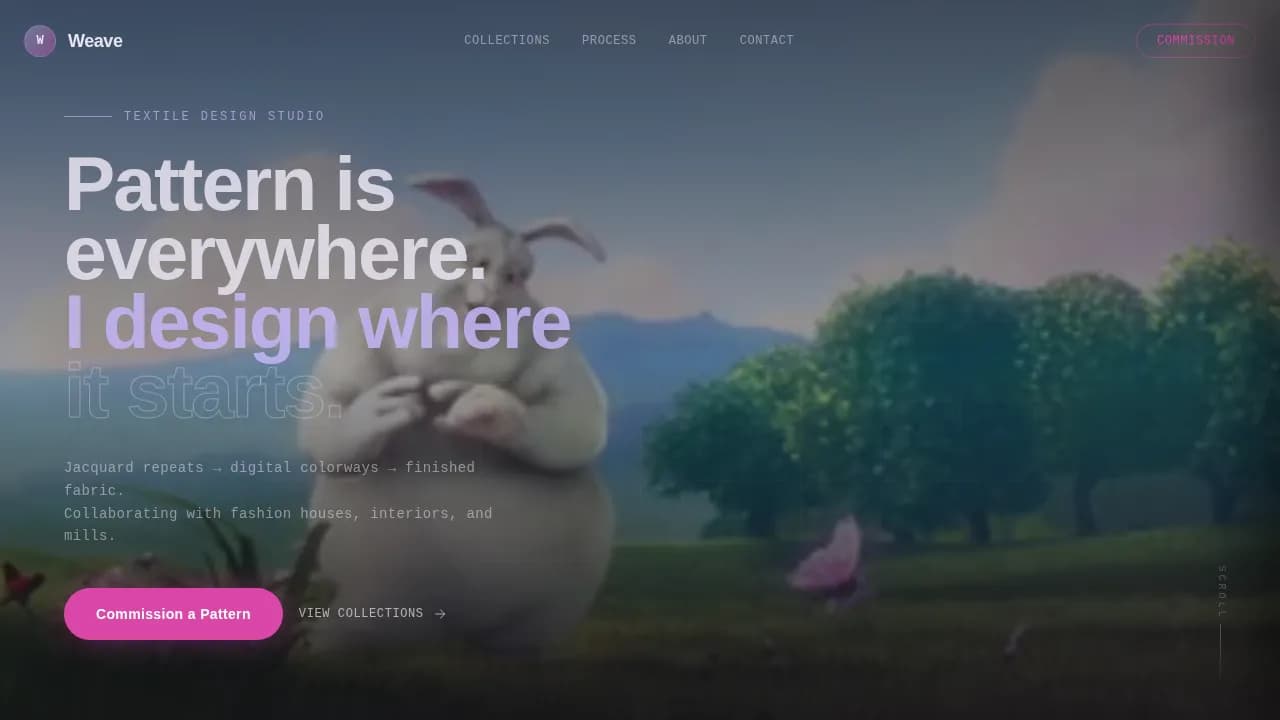 Weave is a single-page portfolio landing page template designed for textile designers working across fashion, interiors, and licensing markets. It combines a full-screen video background, a filterable bento grid, and a slide-in commission form to translate craft into commissions. Every cell, color, and interaction is built to present textile work at its most compelling.