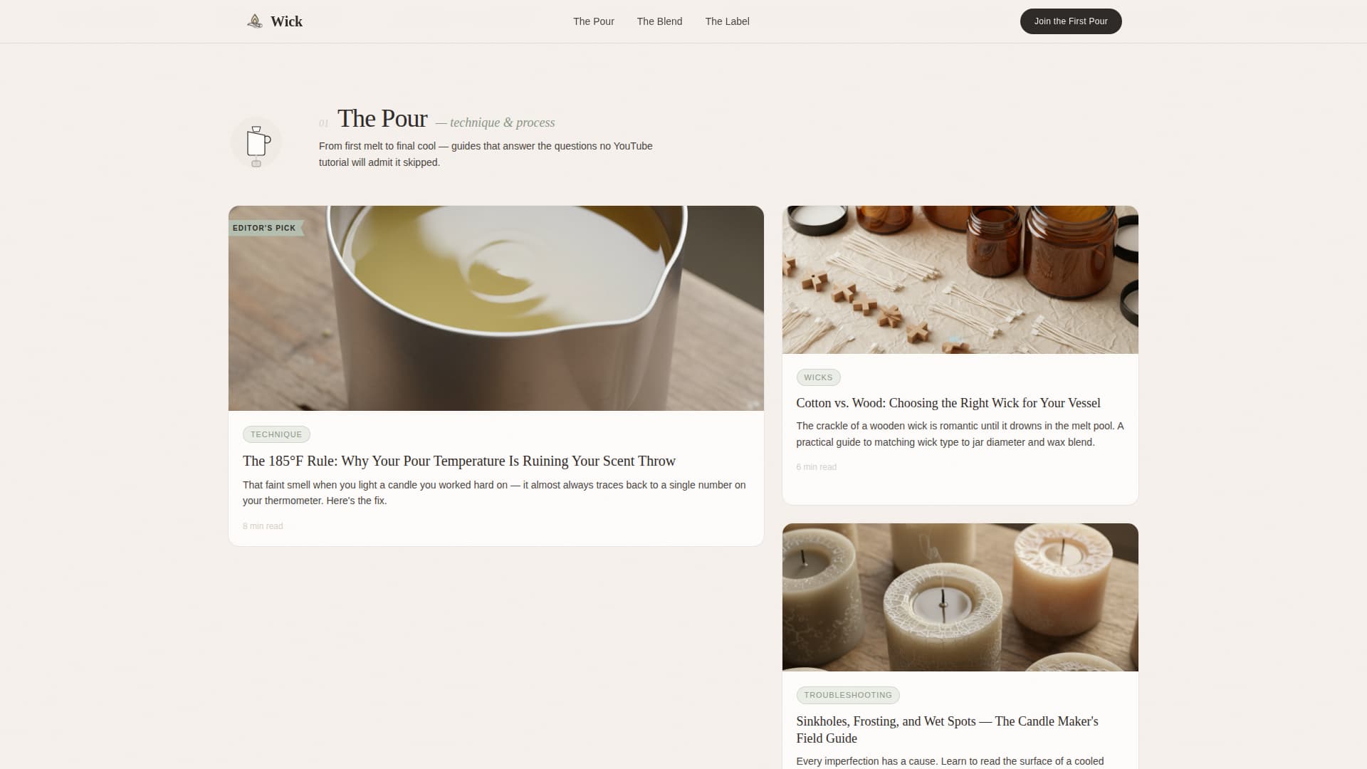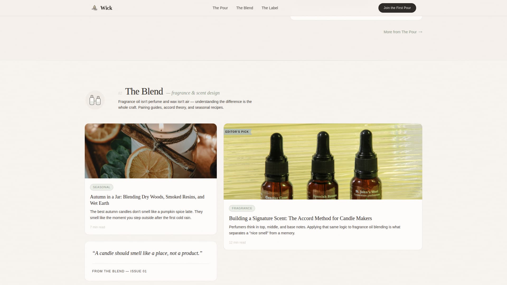Content is organized into three named collections rather than generic category links. "The Pour" covers technique tutorials, "The Blend" covers fragrance pairing guides, and "The Label" addresses branding and selling. Each collection opens with a small spot illustration and a short editorial introduction before revealing article cards.